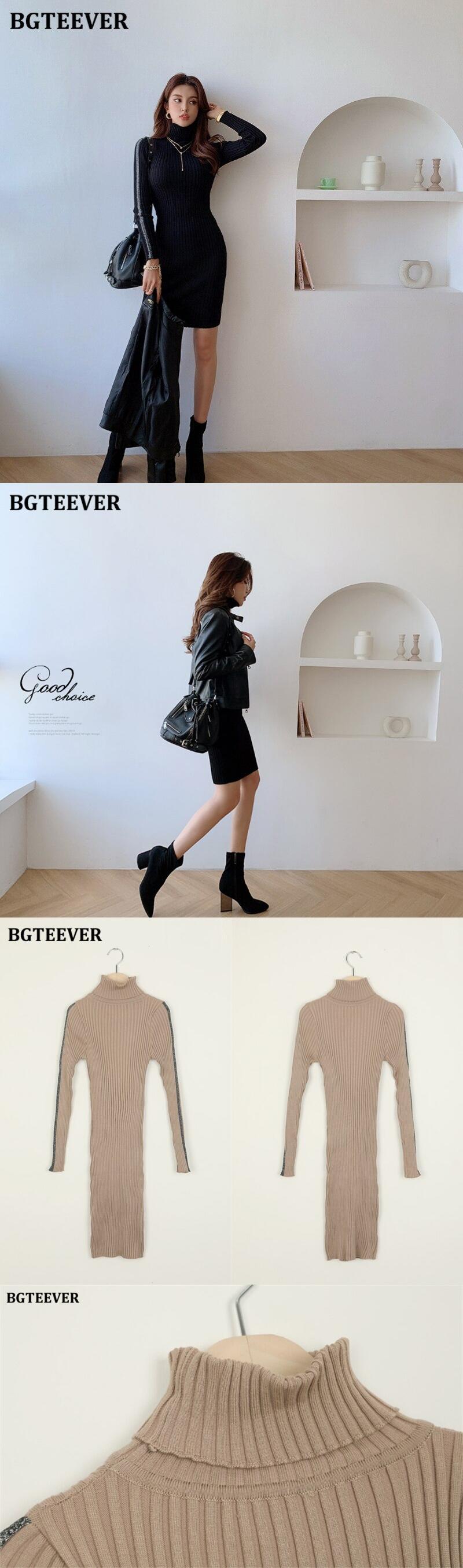 【新作】【送料無料】 BGTEEVERヴィンテージシックなタートルネックウォームスリムニットショートドレス女性2020冬長袖スキニーセーターVestidos ロング ウィンター 冬物 ビンテージ 12b123154043333