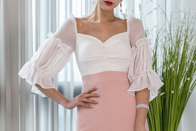 【新作】【送料無料】 Vネックバックレスシフォンパッチワークレディースドレスフレアスリーブヒットカラーミディドレス2019スリムフロントスプリットVestidosファム フェミニン 12b153832688857