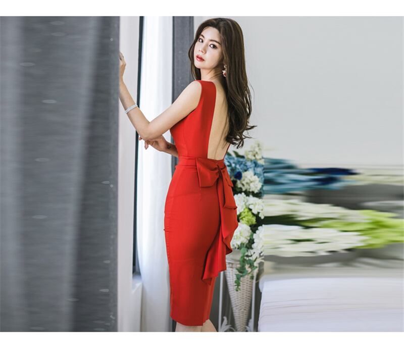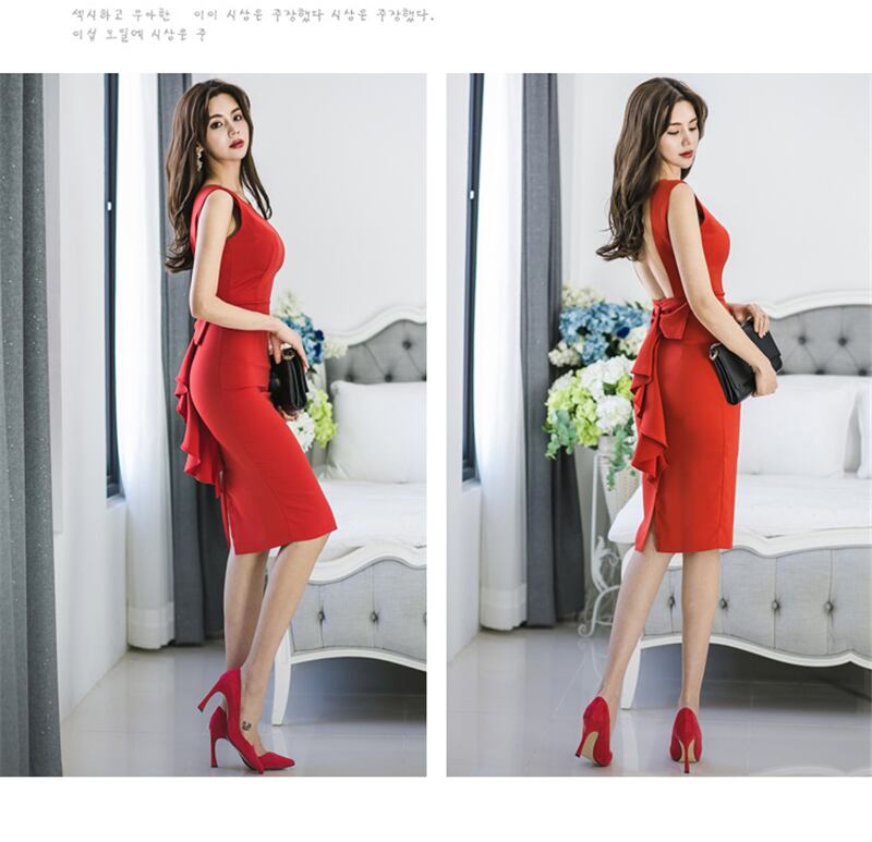【新作】【送料無料】 セクシーな赤い背中の開いたフリルの女性のドレス夏のノースリーブオフィスシース鉛筆ドレス弓付き レッド リボン ラッフル サマー 夏物 会社 学校 通勤や通学にも 12b166134785197