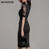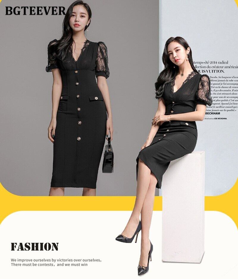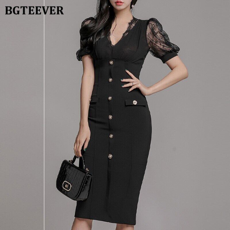 【新作】【送料無料】 BGTEEVER秋のVネックレース女性ボディコンドレス半袖シングルブレストパッケージヒップスリムミディVestidos ショート ハーフスリーブ オータム 秋物 12b172176830121