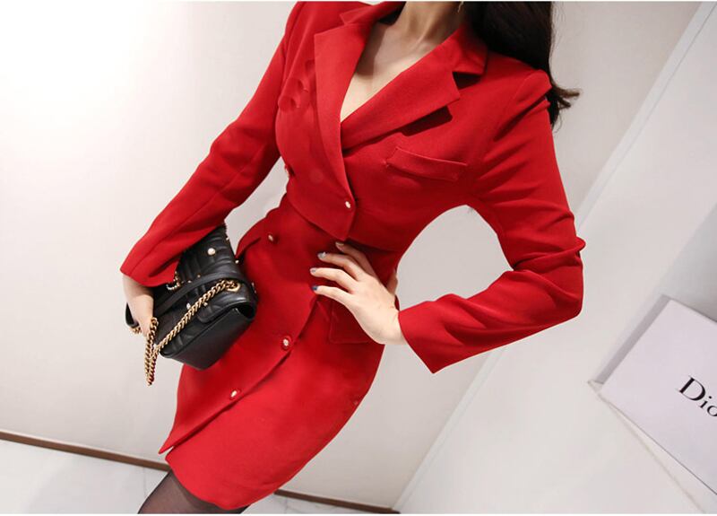 【新作】【送料無料】 フェイク-2ピースセットダブルブレストレディースブレザードレス2019オフィスボディコンショートドレスヒップパッケージVestidos 会社 学校 通勤や通学にも 12b130420497570