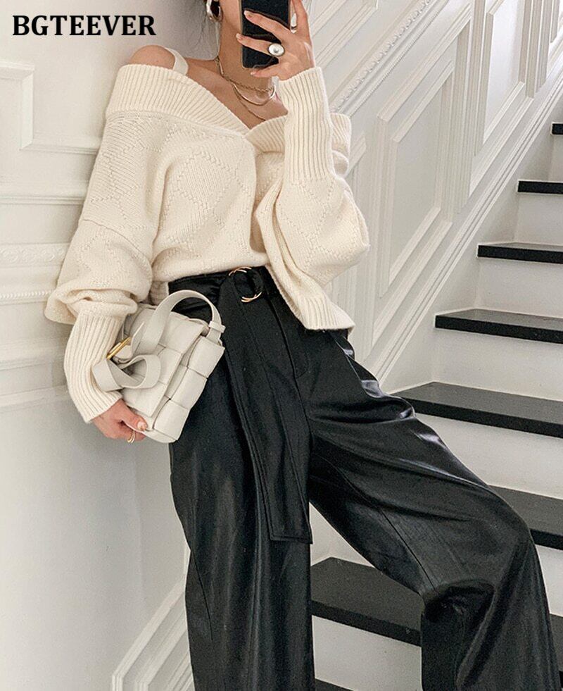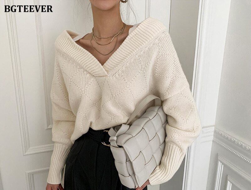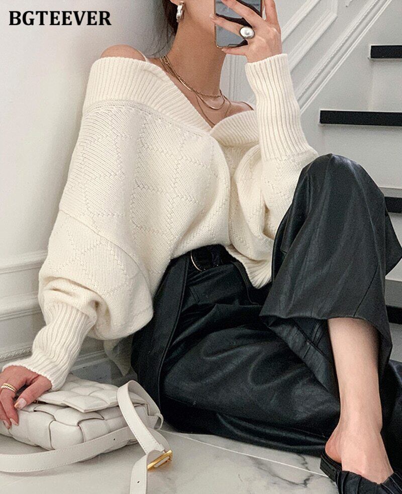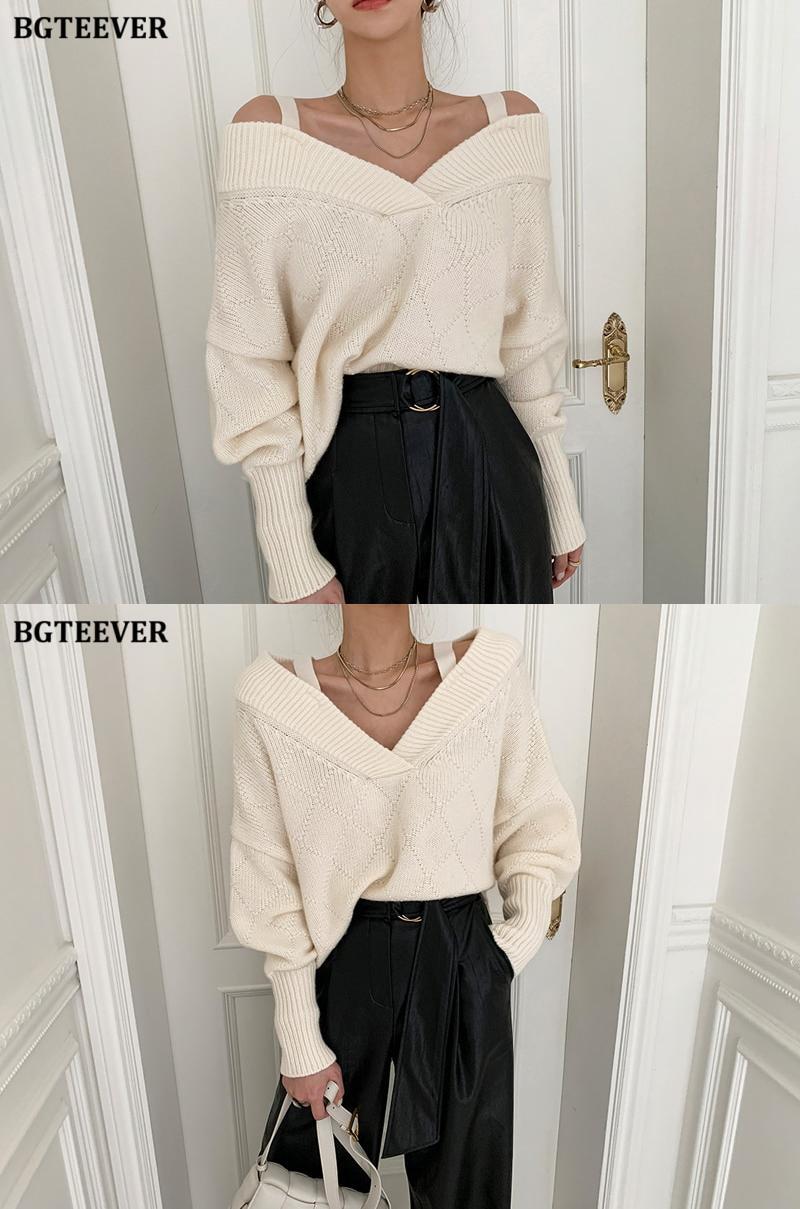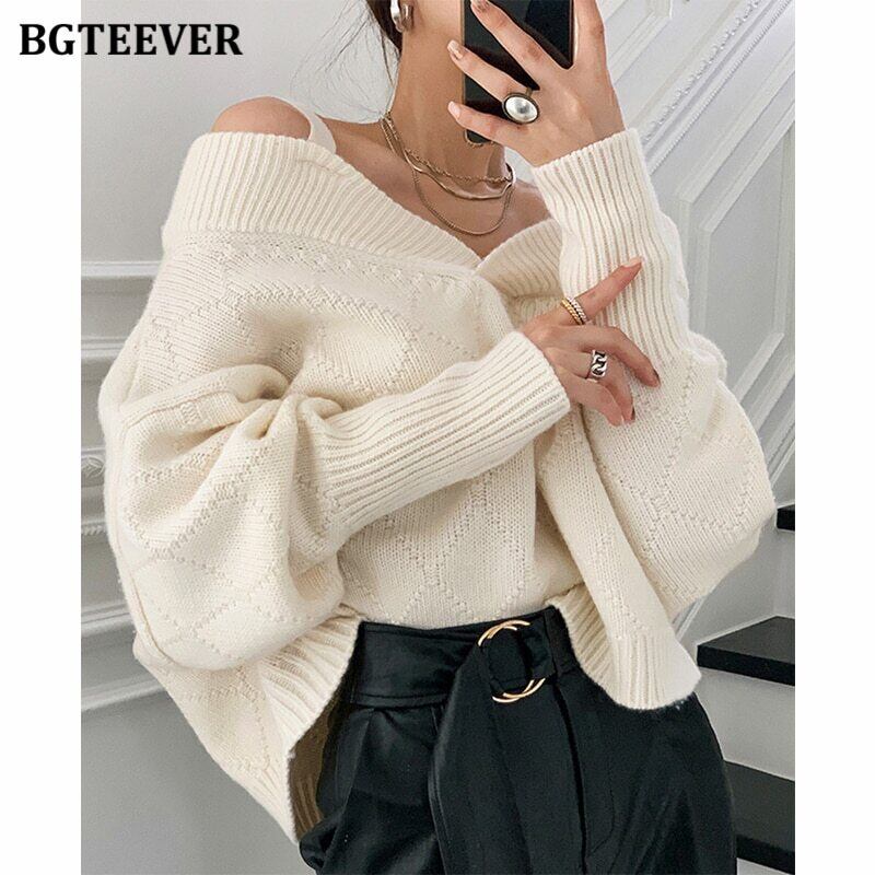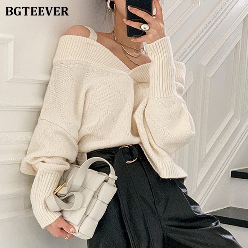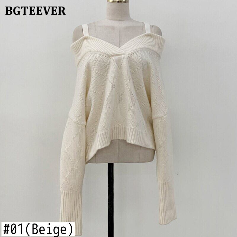 【新作】【送料無料】 BGTEEVERVネックレディースソリッドニットセーターウィンターシックオフショルダー長袖プルオーバージャンパー2020 ロング 冬物 ソリッドカラー 12b196352157837