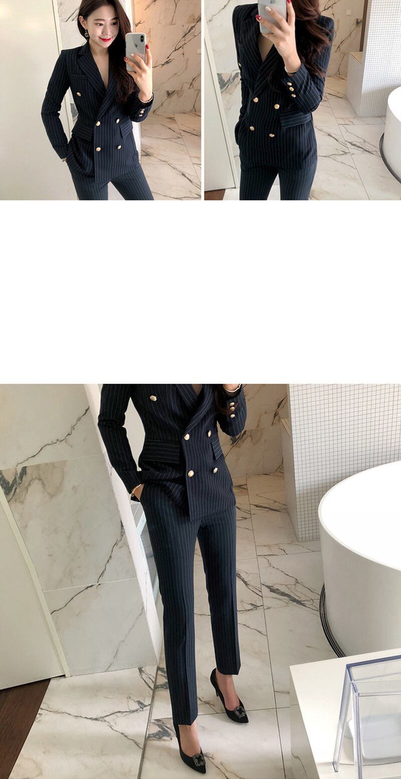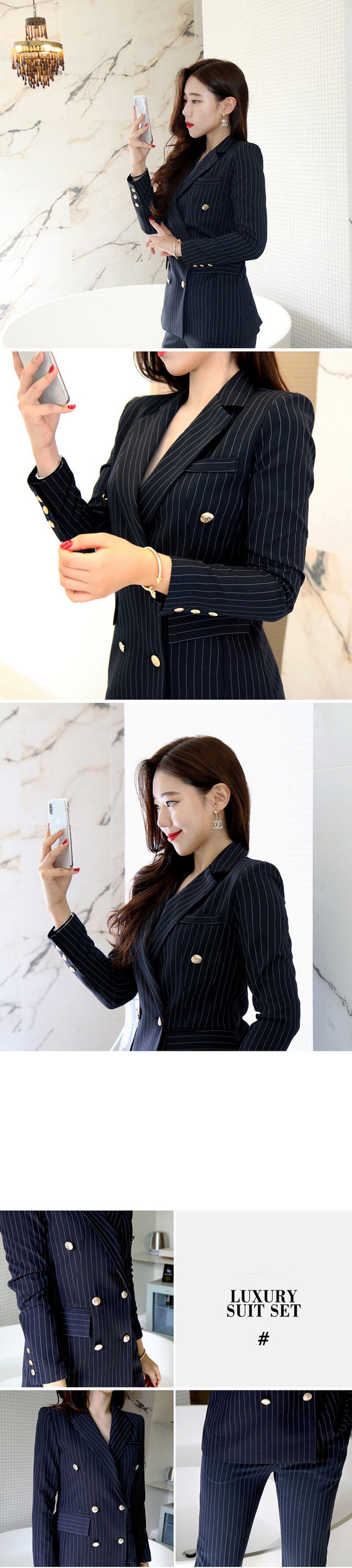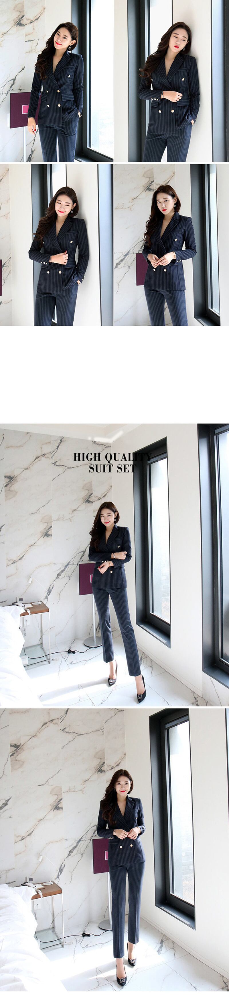 【新作】【送料無料】 オフィスダブルブレストストライプレディースパンツスーツスリムウエストブレザージャケット&ウエストペンシルパンツOLスタイル2点セット 会社 学校 通勤や通学にも 12b120128174223