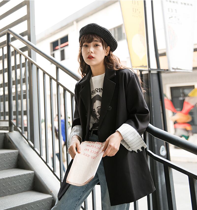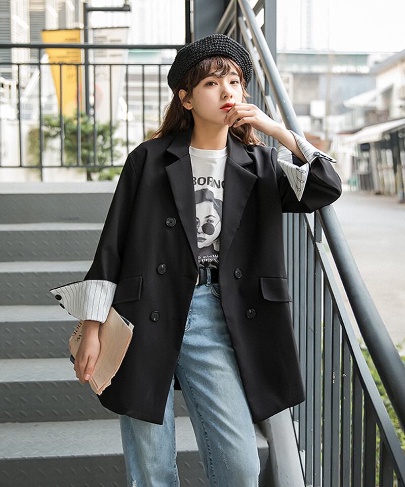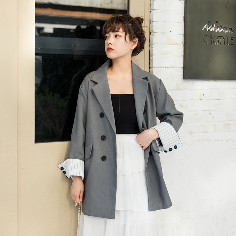 【新作】【送料無料】 ストライプパッチワークダブルブレストレディースブレザージャケットソリッドルースブレザーオフィスワークウェア2019 ソリッドカラー 会社 学校 通勤や通学にも 12b188353360026