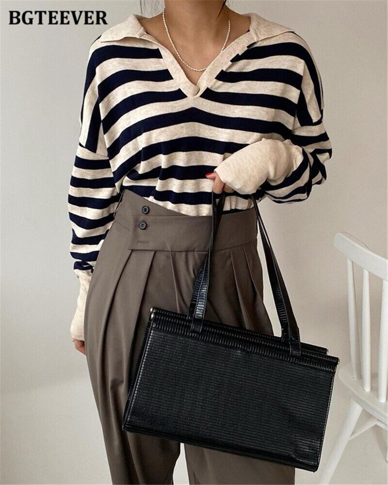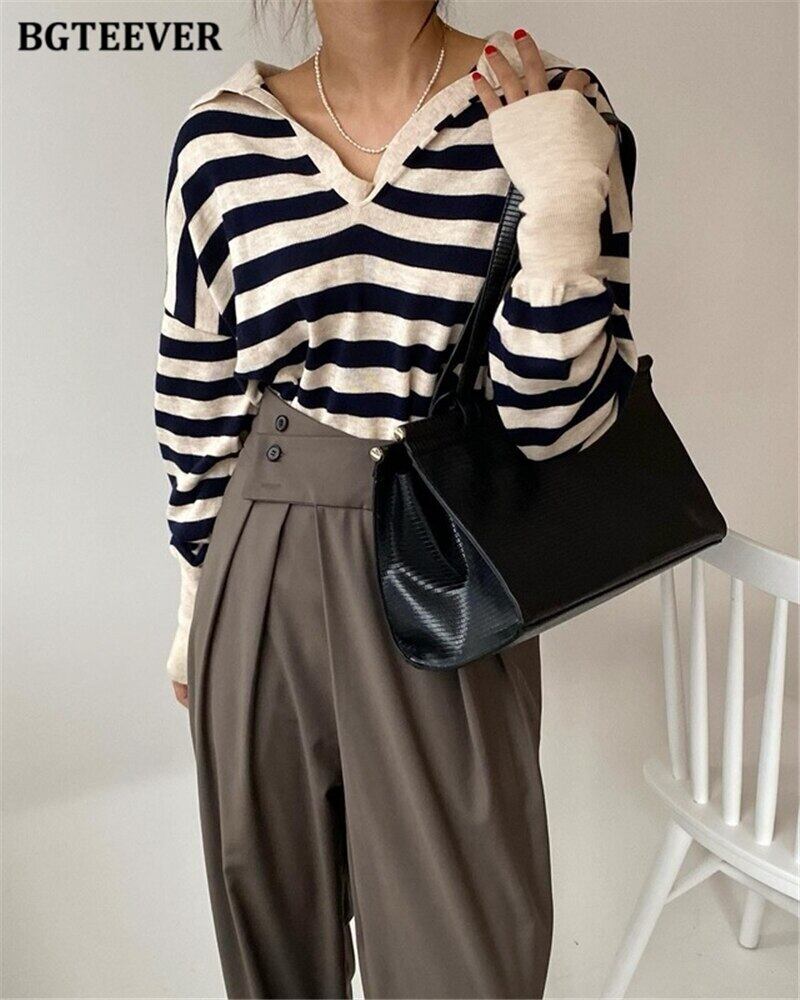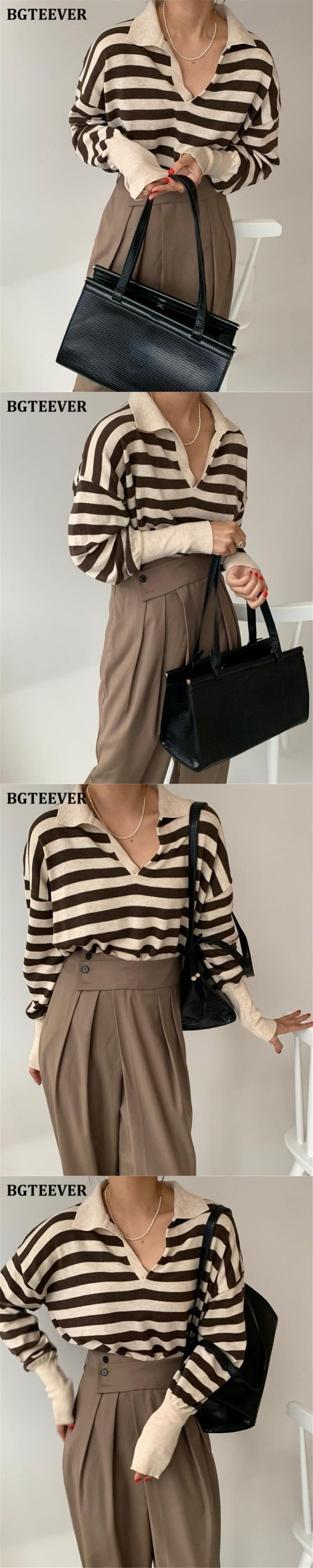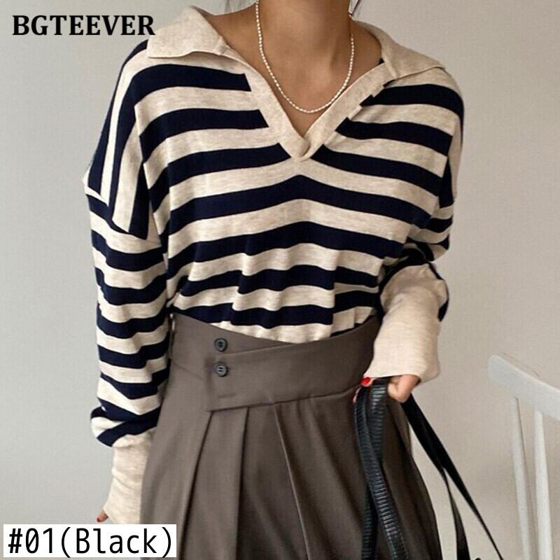 【新作】【送料無料】 BGTEEVERストライプレディースセーターターンダウンカラーフルスリーブルーズニットプルオーバー秋冬ジャンパー オータム 秋物 ウィンター 冬物 12b161065803856