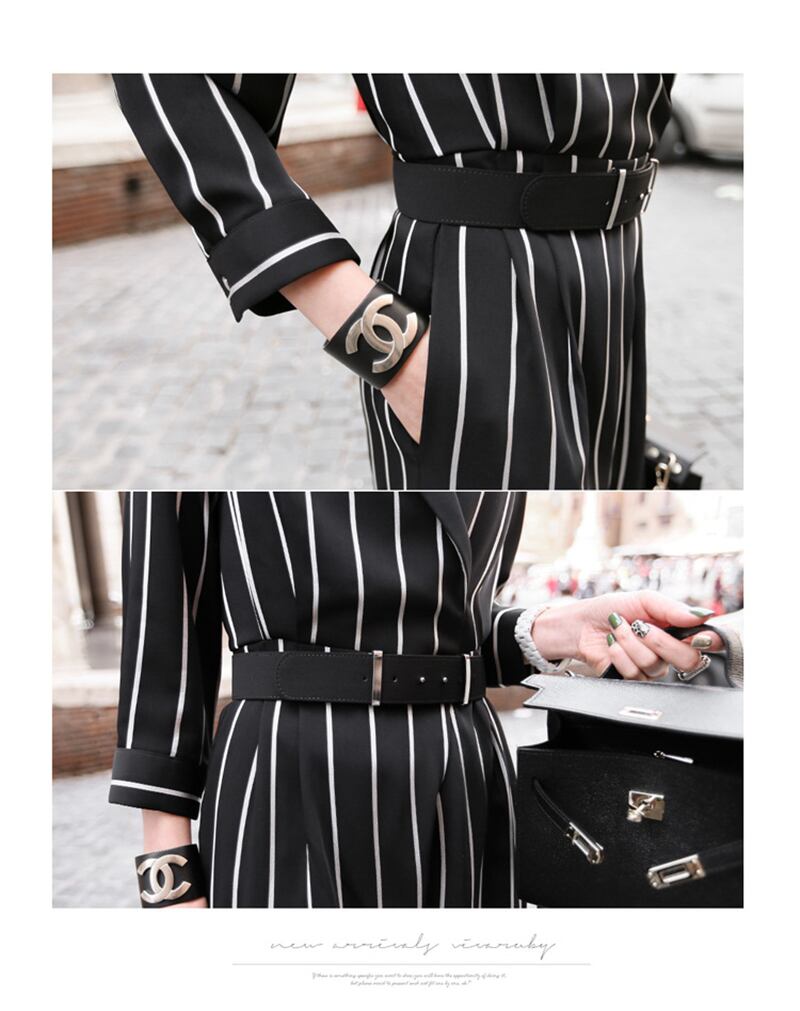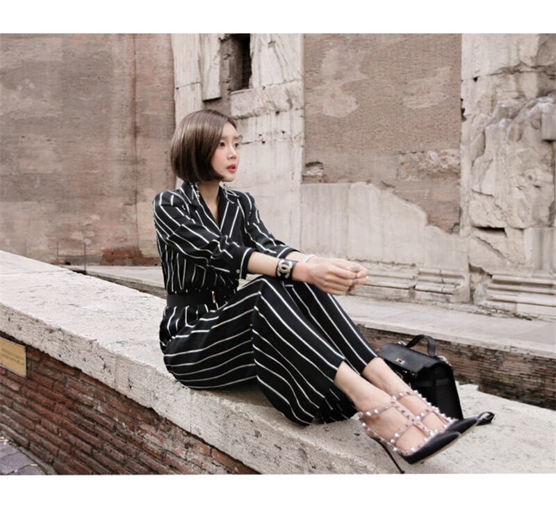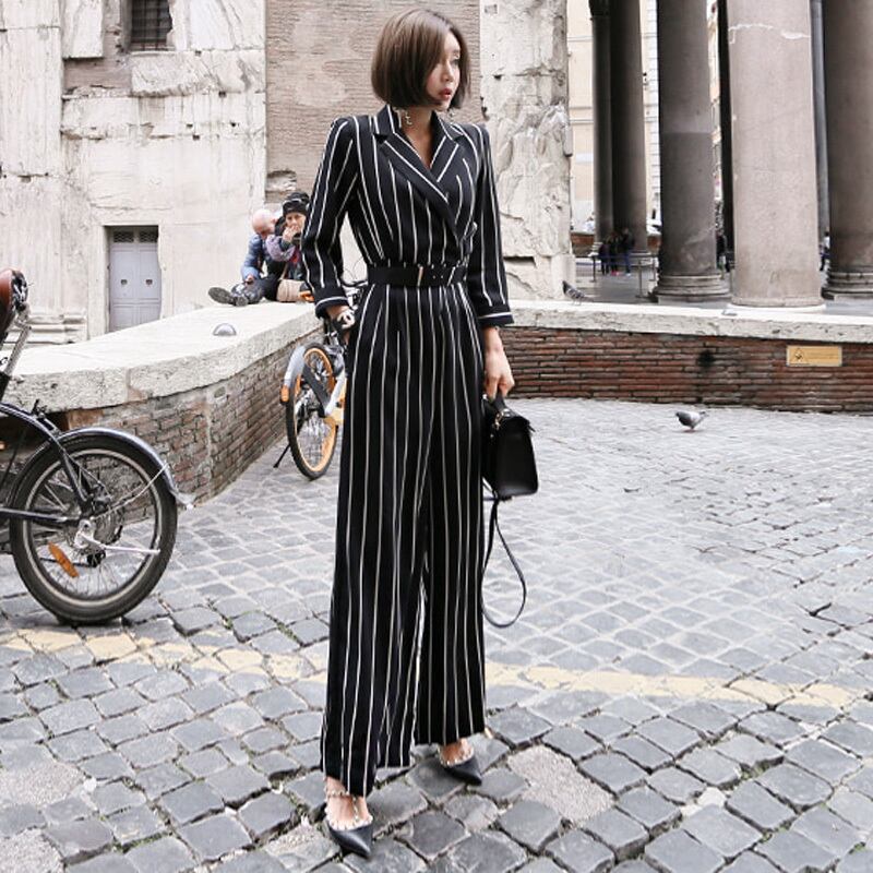 【新作】【送料無料】 ノッチカラーサッシストライプジャンプスーツ黒人女性ワークビジネスルーズパンツジャンプスーツスリムウエストロングプレイスーツ2019 ブラック 12b164778038867