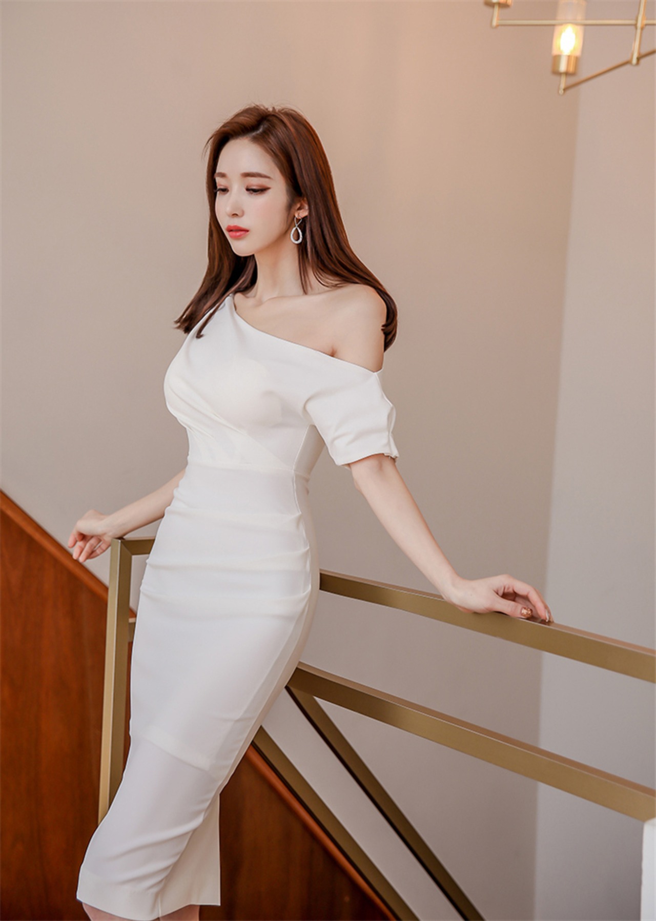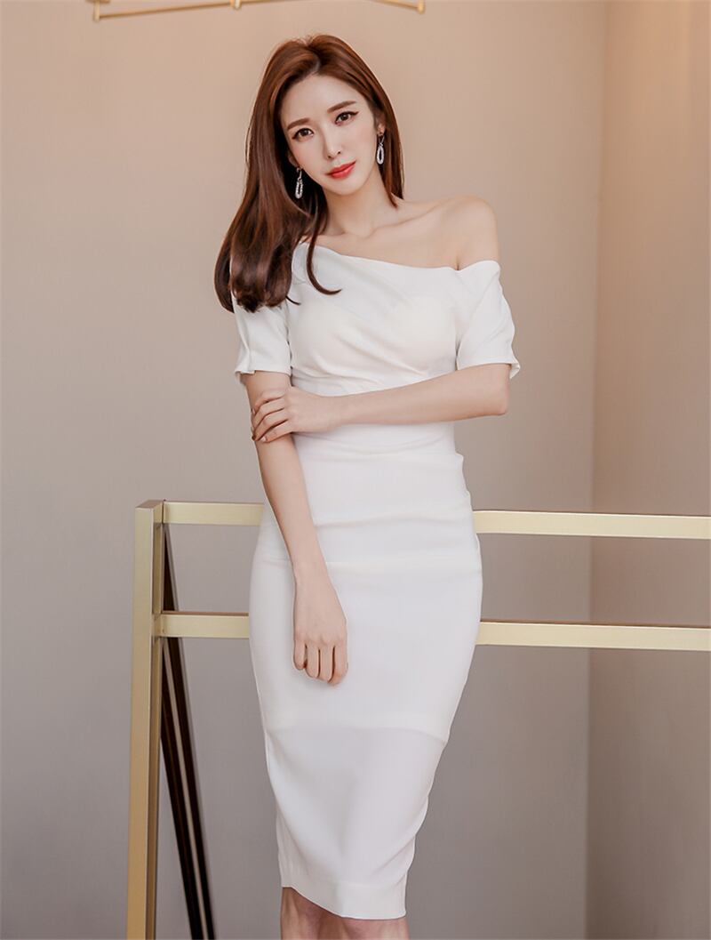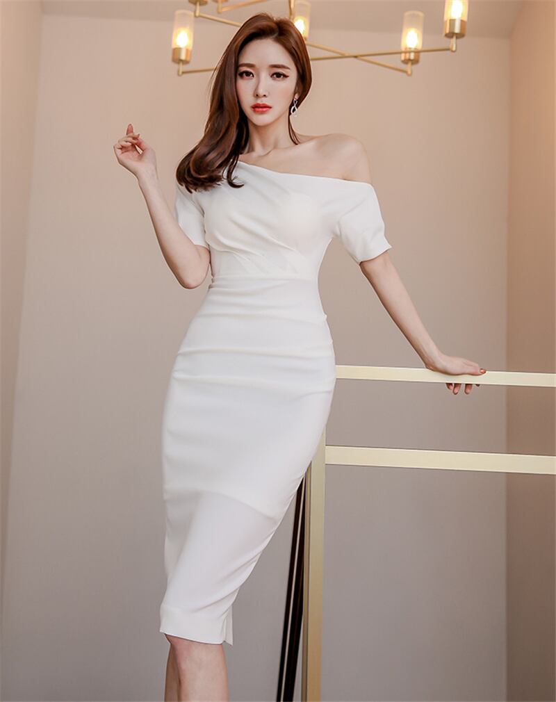 【新作】【送料無料】 オフィスシングルショルダーレディースホワイトドレスOLワークウェアミドル丈ペンシルドレス2019Irregular Vestidos 会社 学校 通勤や通学にも 12b164754990819