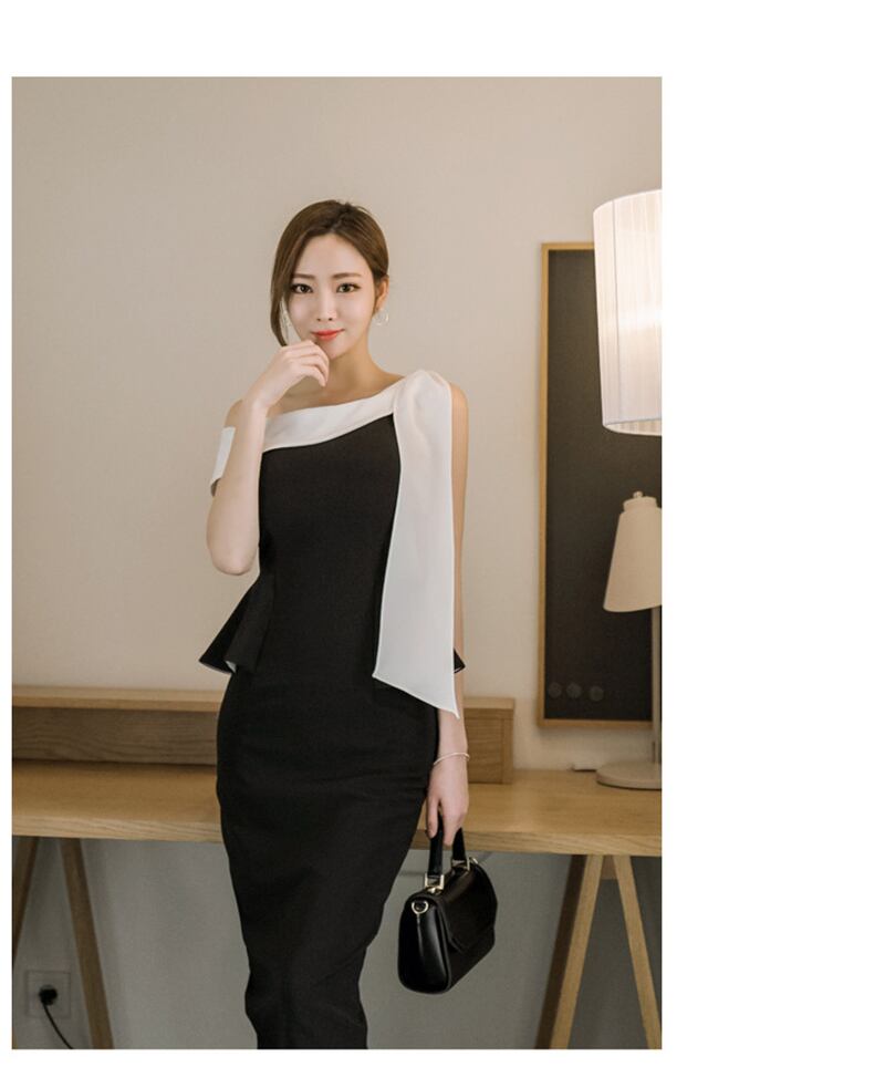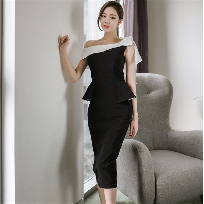 【新作】【送料無料】 オフショルダースラッシュネックセクシーボディコンドレス女性2019夏コントラストカラードレスドレープボウペンシルVestidos リボン サマー 夏物 12b181598819031
