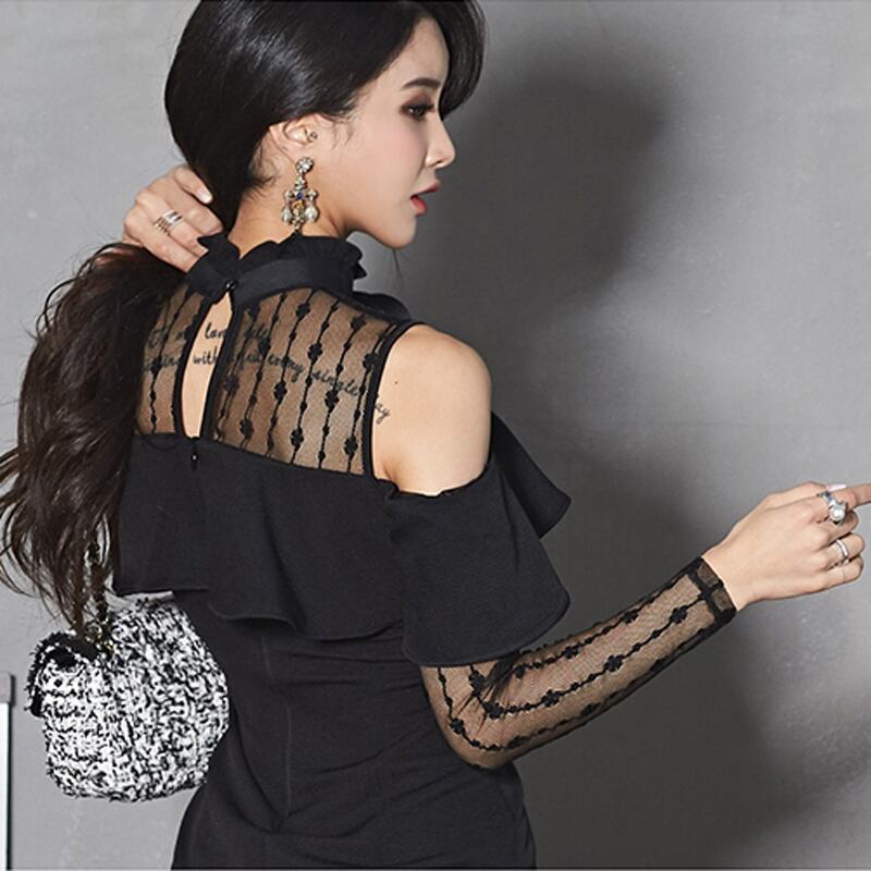 【新作】【送料無料】 セクシーなコールドショルダーフリルシース女性ブラックドレス2019春レースパッチワークショートドレススリムペンシルボディコンVestidos ラッフル スプリング 春物 12b179610285821