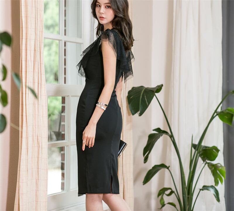 【新作】【送料無料】 セクシーなブラックメッシュパッチワーク女性シースドレスOネックフリル透明ペンシルドレス2019パーティーVestidosfemme ラッフル フェミニン 12b149322661524