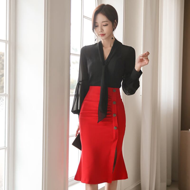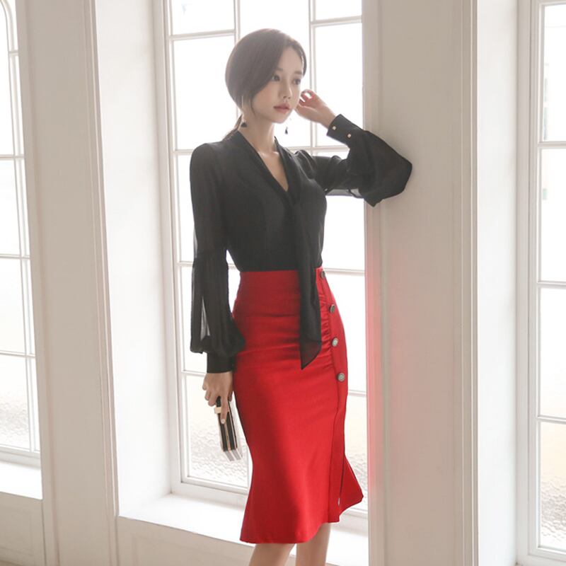 【新作】【送料無料】 2ピースセットVネックランタンスリーブブラックブラウス&サイドスプリットレッドスカートOLスタイルレディースセット2018 12b16333274303