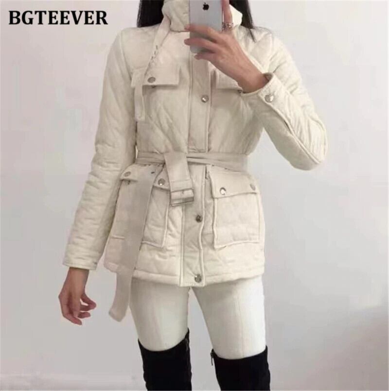 【新作】【送料無料】 BGTEEVERスタイリッシュなシングルブレストの女性アーガイルチェック柄パーカー冬の長袖ベルト付きウォームスリムコットンパッド入りジャケット2020 ロング ウィンター 冬物 ハーネス 12b15996795928