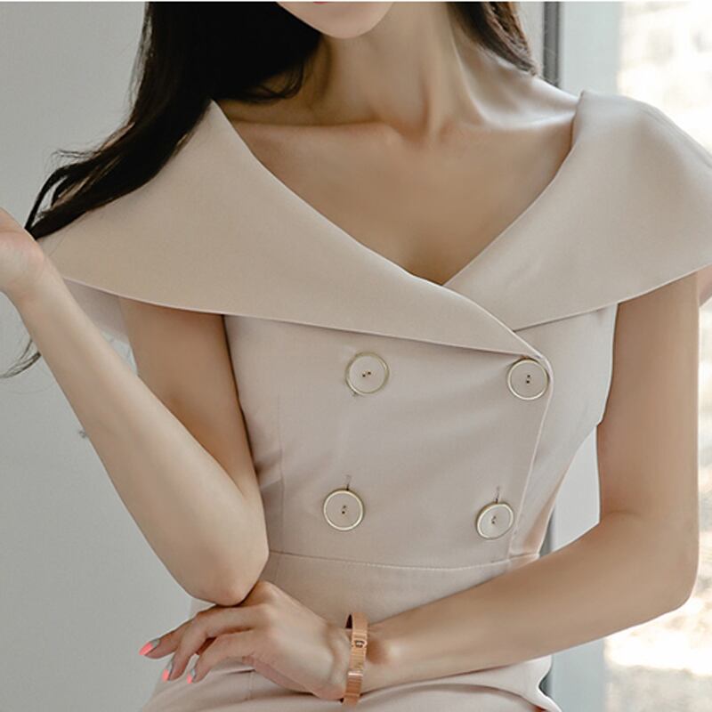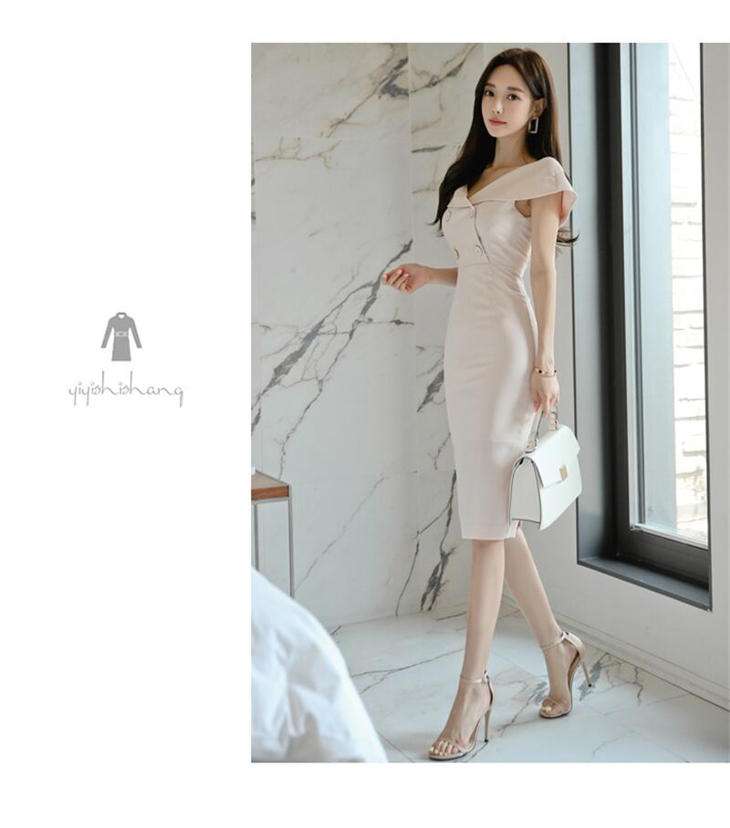 【新作】【送料無料】 オフィスサマードレスVネックフロントボタン膝丈レディースドレススリムウエストVestidosローブファム2019 夏物 フェミニン 会社 学校 通勤や通学にも 12b195127659738