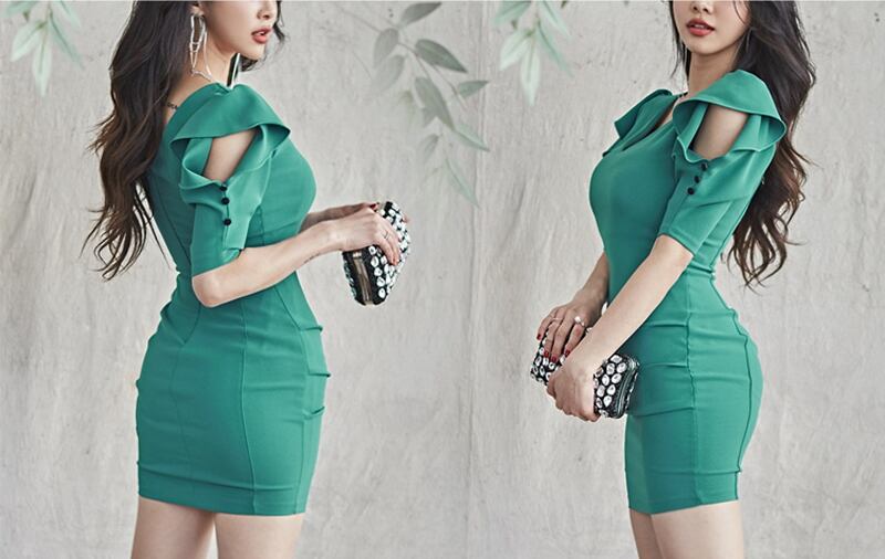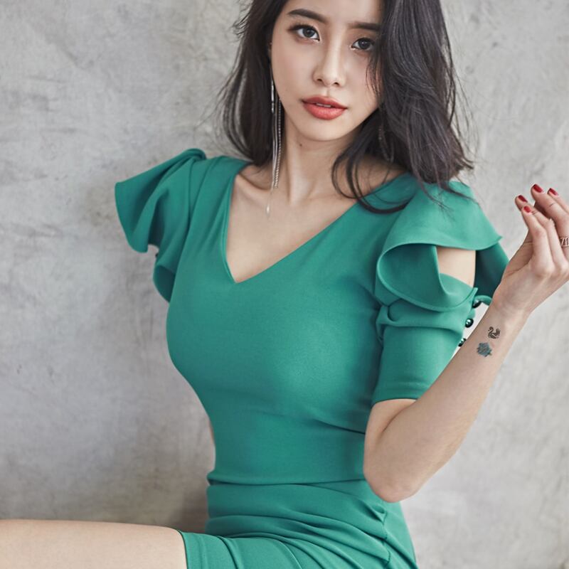 【新作】【送料無料】 セクシーなVネックシースボディコン女性ショートドレスフリルスリーブスリムウエストミニドレスグリーンパーティーVestidosfemme 2019 フェミニン 12b147330553011