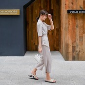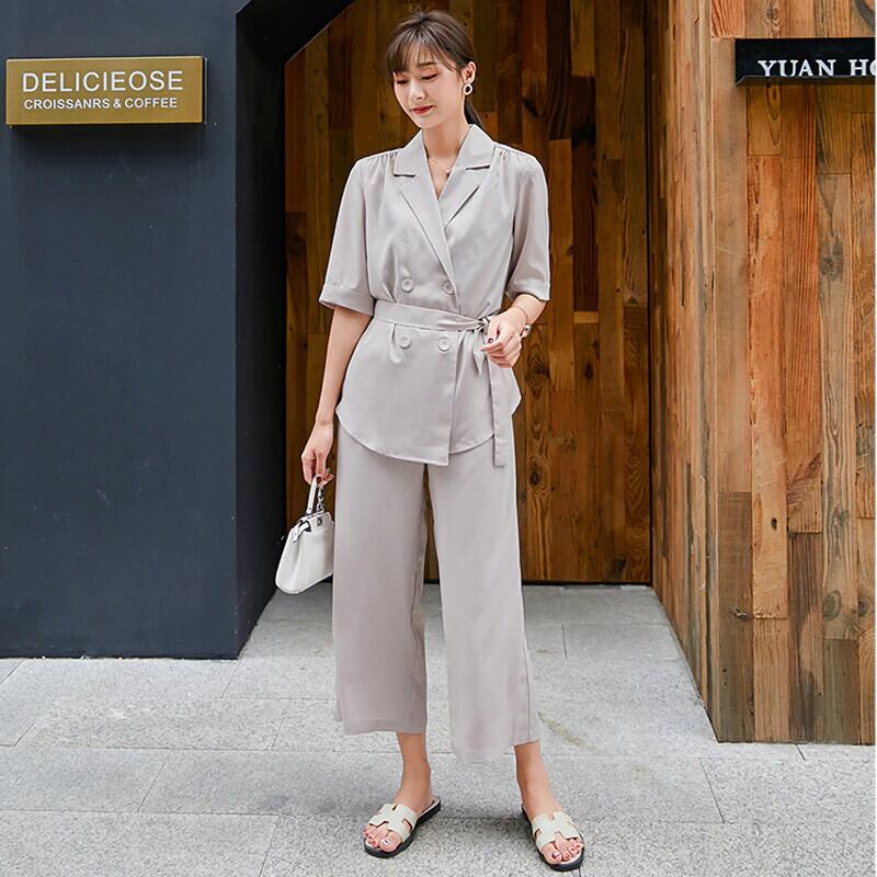 【新作】【送料無料】 夏の女性パンツスーツダブルブレスト半袖レースアップジャケットブレザー&伸縮性ウエストルーズパンツ2点セット ショート ハーフスリーブ エラスティック サマー 夏物 12b143617726739
