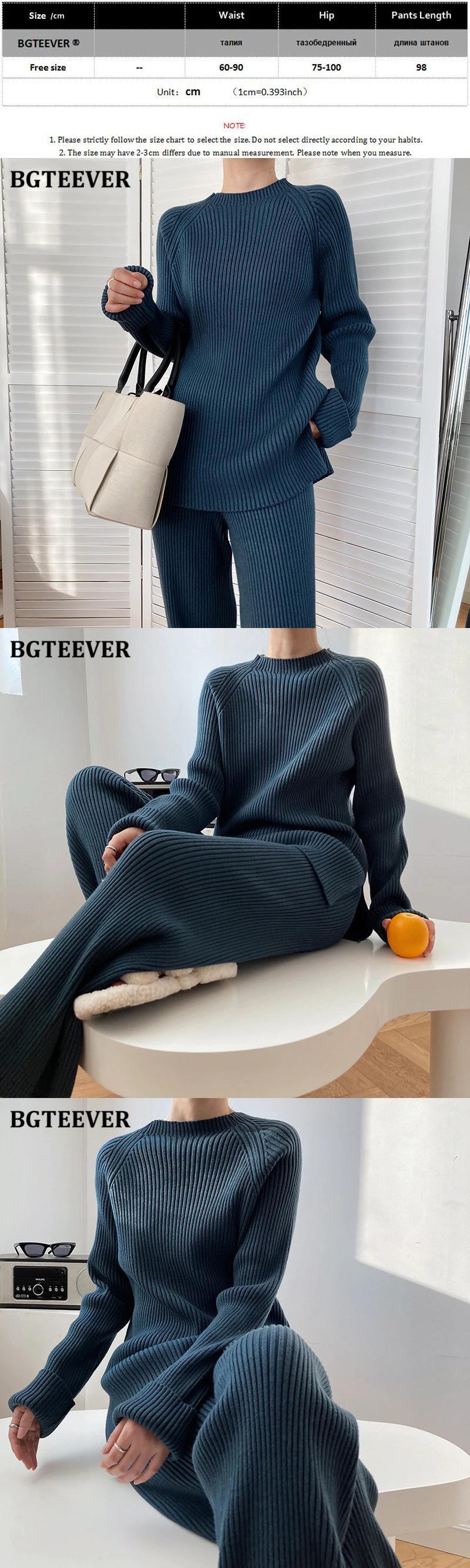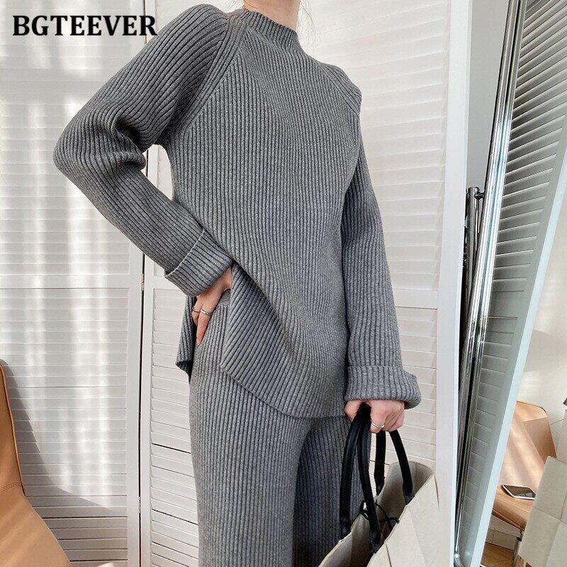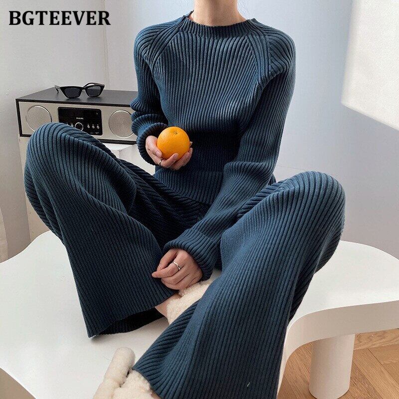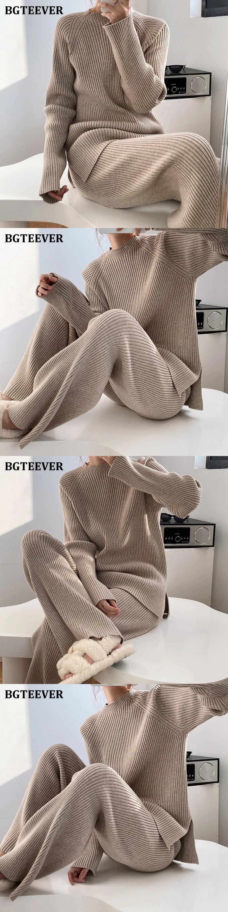 【新作】【送料無料】 BGTEEVER Winter Thicken Knitted 2 Pieces Set Women O-neck Split Jumpers&Wide Leg Sweater Pants 2020 Sweater Set ウィンター 冬物 Oネック ワイドレッグ ワイドパンツ 12b176400134807