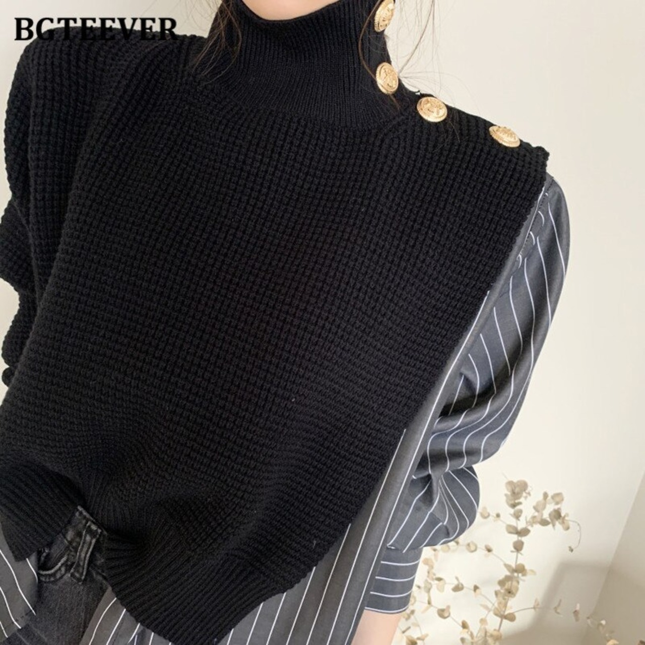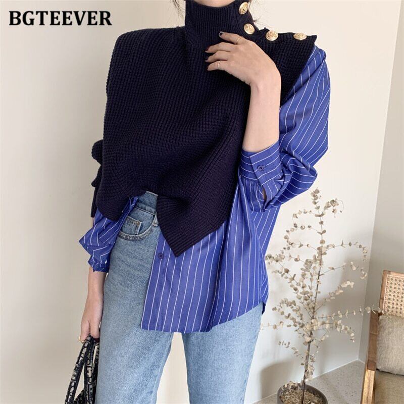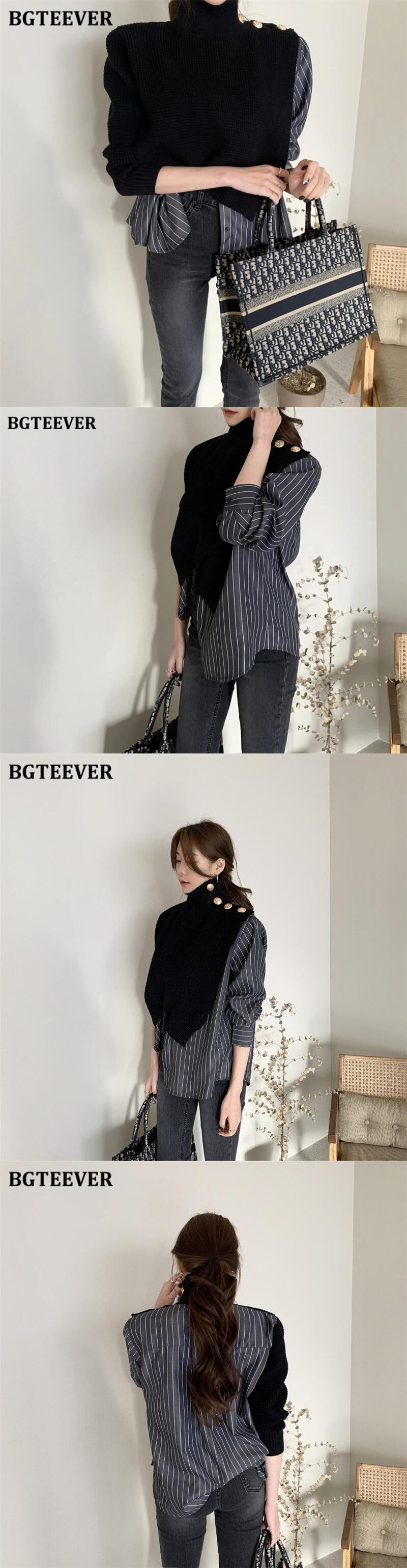 【新作】【送料無料】 BGTEEVER秋冬タートルネックボタンパッチワーク女性セータージャンパー長袖ルーズニットストライププルオーバー ロング オータム 秋物 ウィンター 冬物 12b168750200650