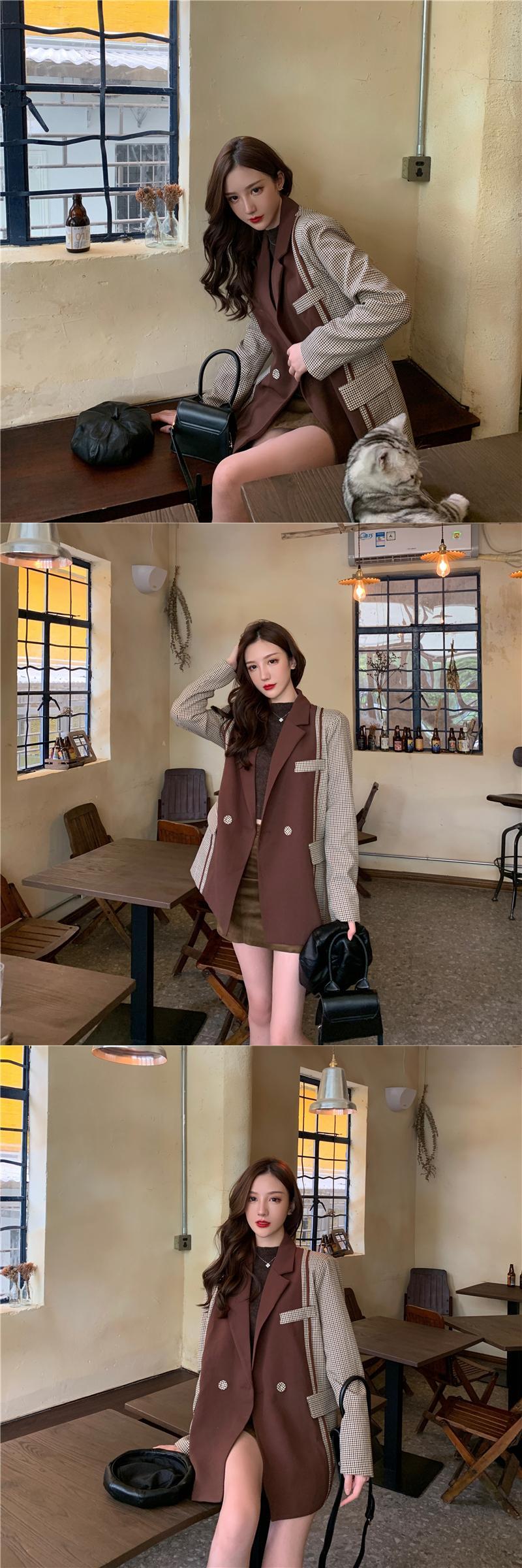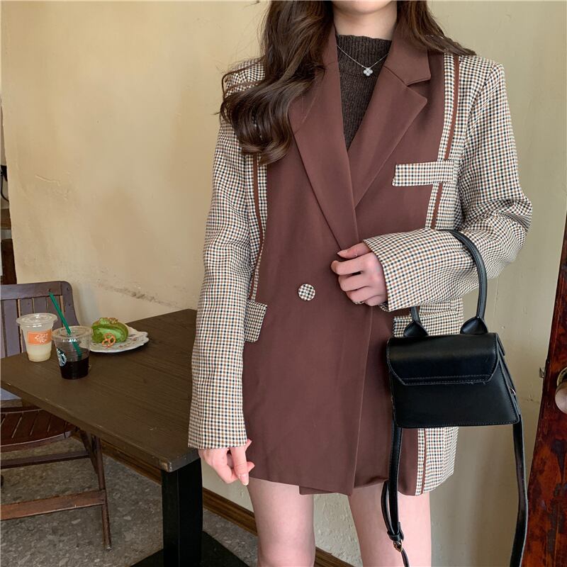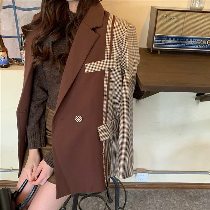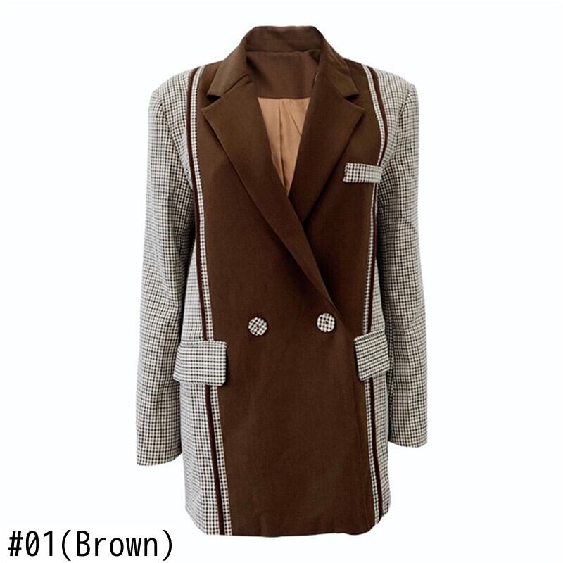 【新作】【送料無料】 BGTEEVERヴィンテージチェック柄レディースブレザーパッチワークスーツジャケットアウターワークスタイルグリッドレディーススーツコート冬2019 ウィンター 冬物 ビンテージ 12b199785223369