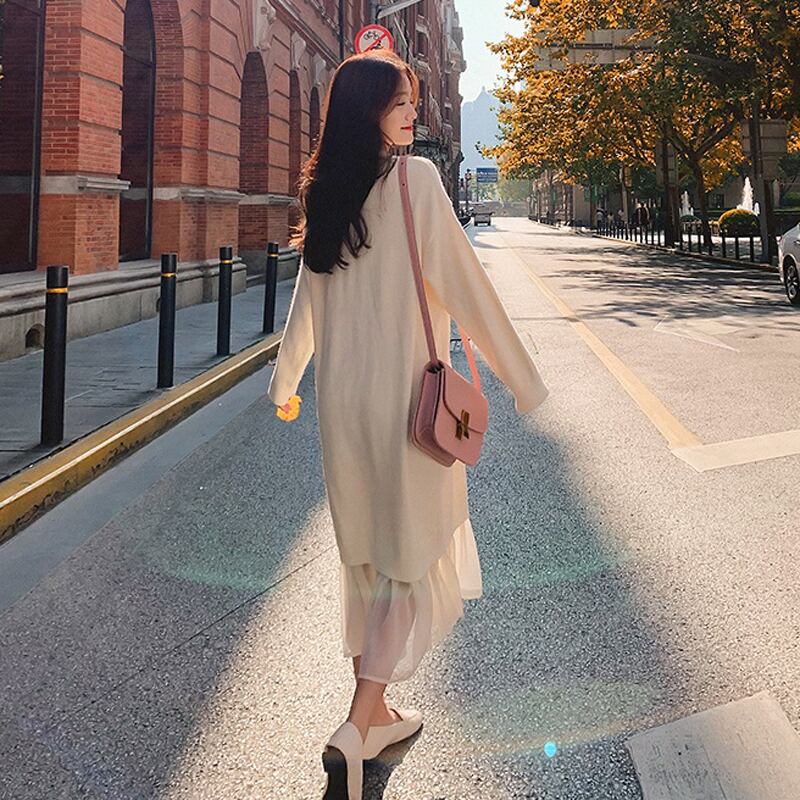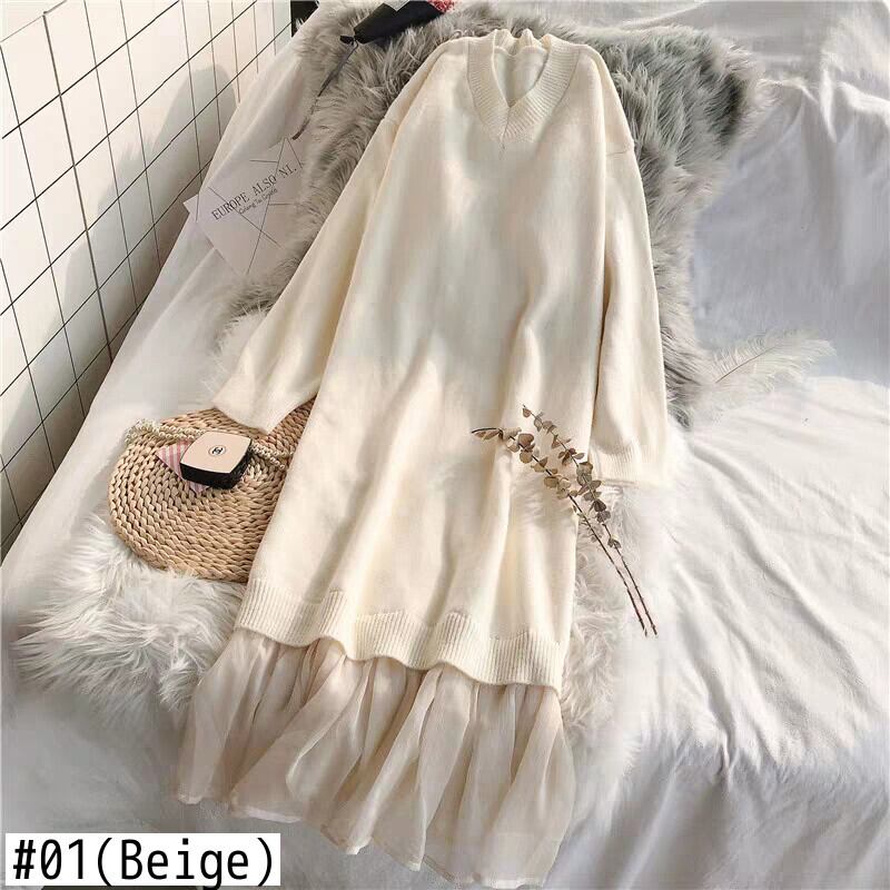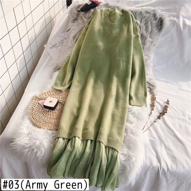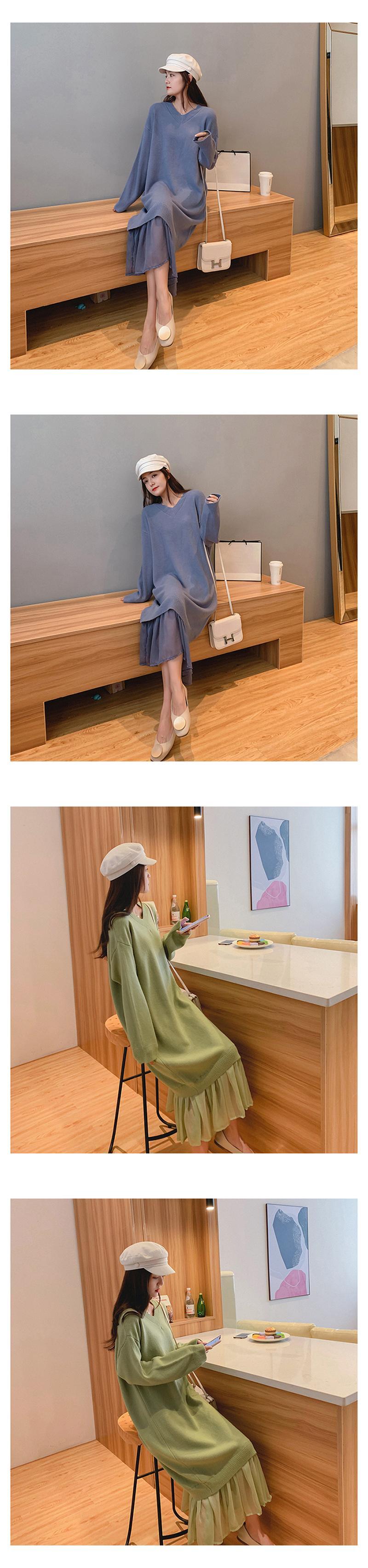 【新作】【送料無料】 BGTEEVERVネックルースウィミンセータードレス秋冬ドレスフリルパッチワークロングニット ラッフル オータム 秋物 ウィンター 冬物 12b156360307822