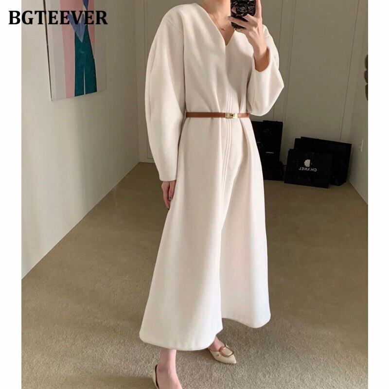 【新作】【送料無料】 BGTEEVERVネック長袖女性ミドル丈ドレスオフィスウェアベルト付き春ソリッドドレス ロング スプリング 春物 ハーネス ソリッドカラー 会社 学校 通勤や通学にも 12b117921502018