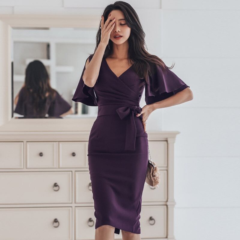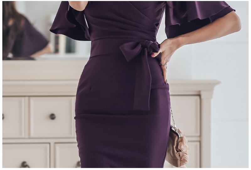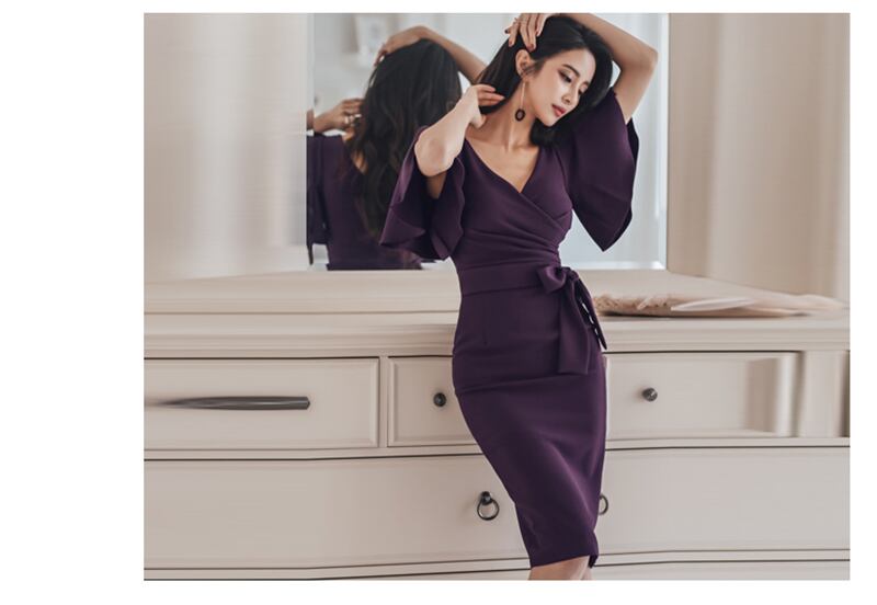【新作】【送料無料】 Vネックレースアップフリルレディースドレスセクシーヒップパッケージミドル丈クロークスリーブドレス2019OLスタイルvestidosfemme ラッフル フェミニン 12b187025455854