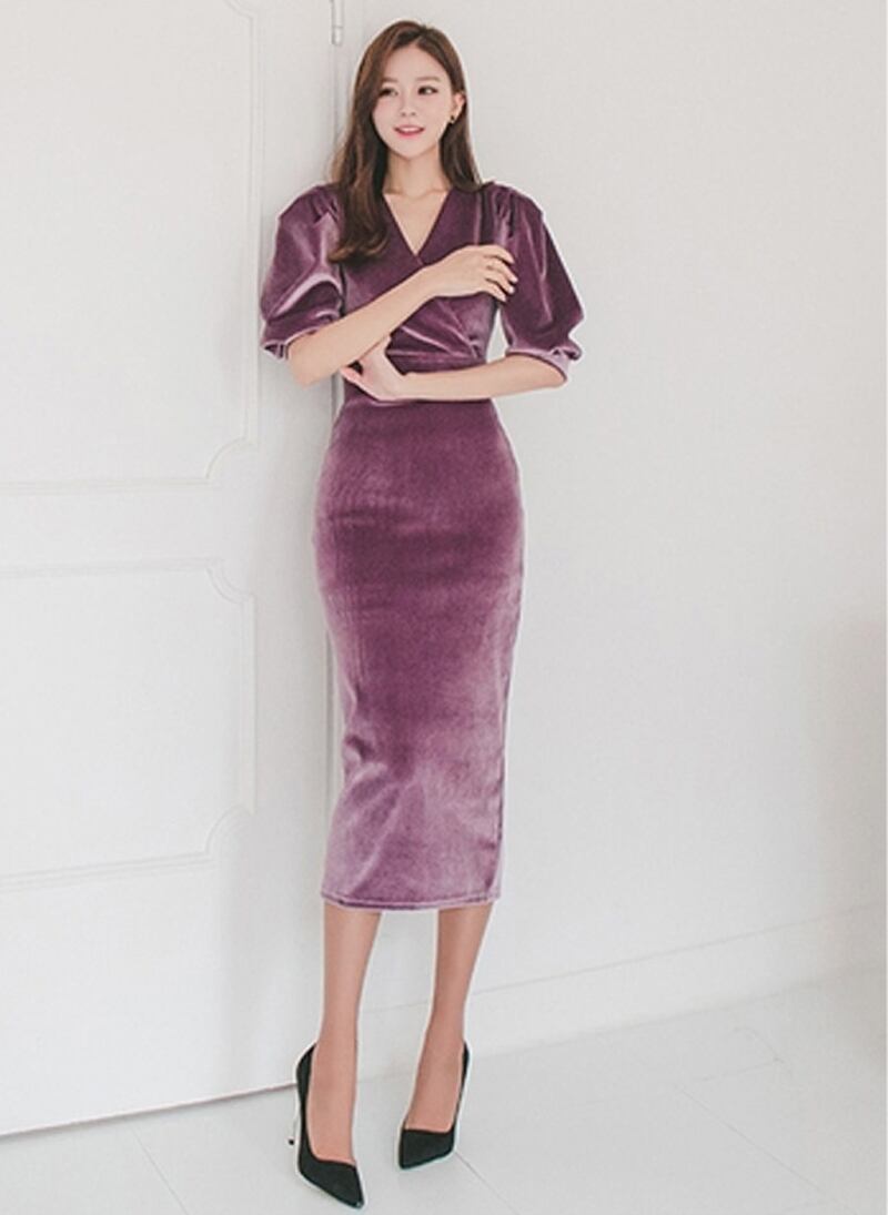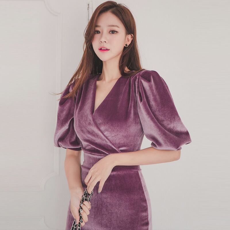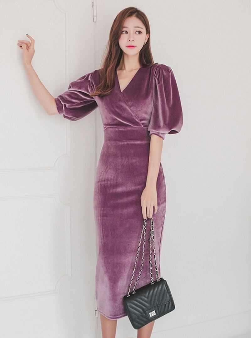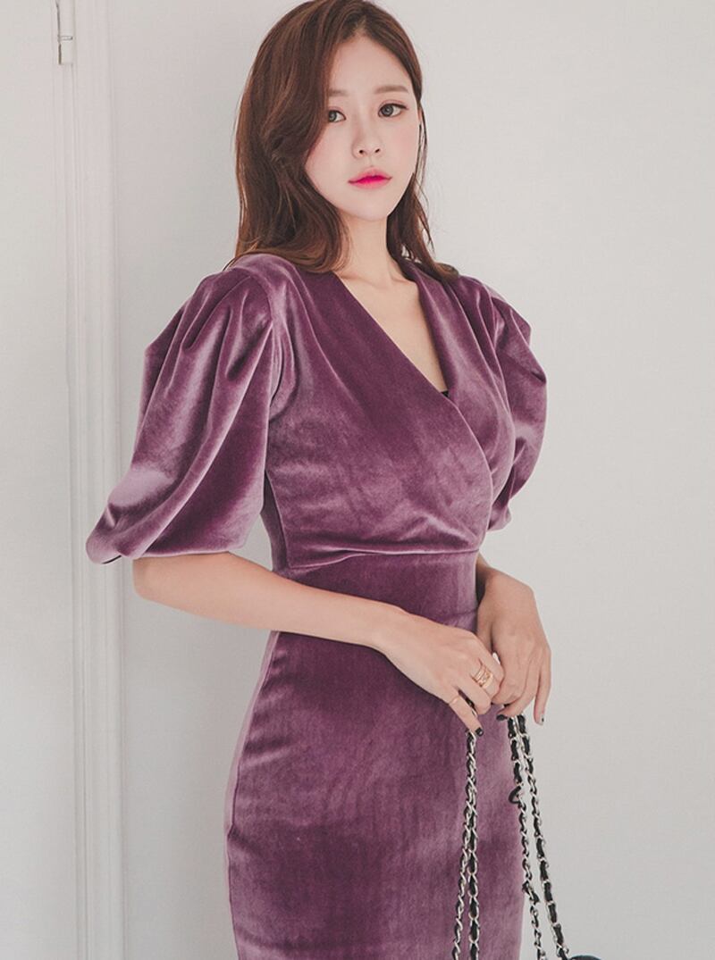 【新作】【送料無料】 パフスリーブベルベットレディースドレス2019Vネックスリムウエストイブニングスペシャルオケージョンミドル丈ドレスペンシルヴェスティドス 12b194298468569
