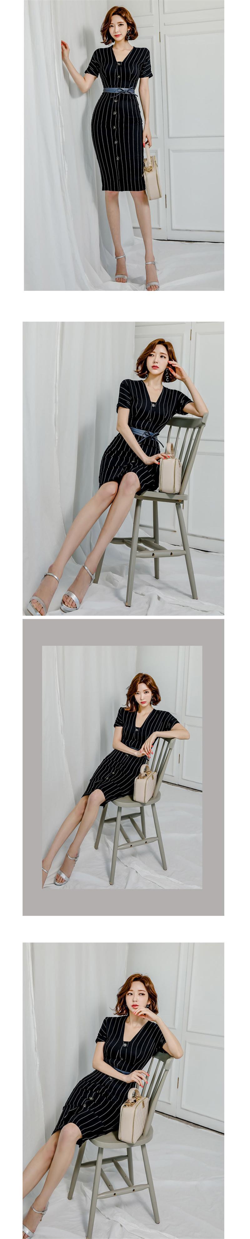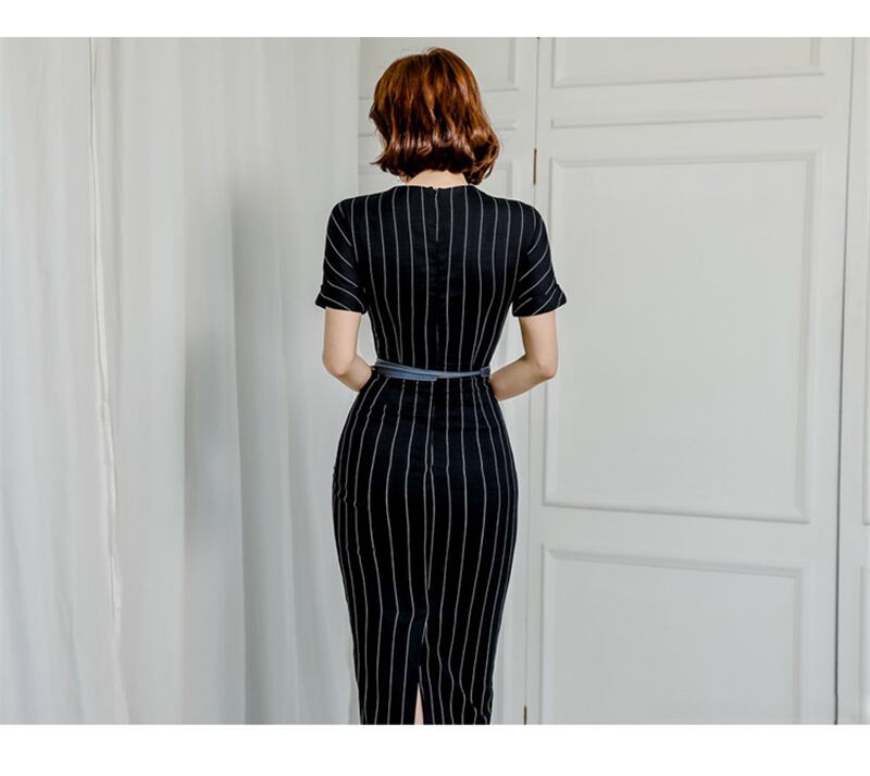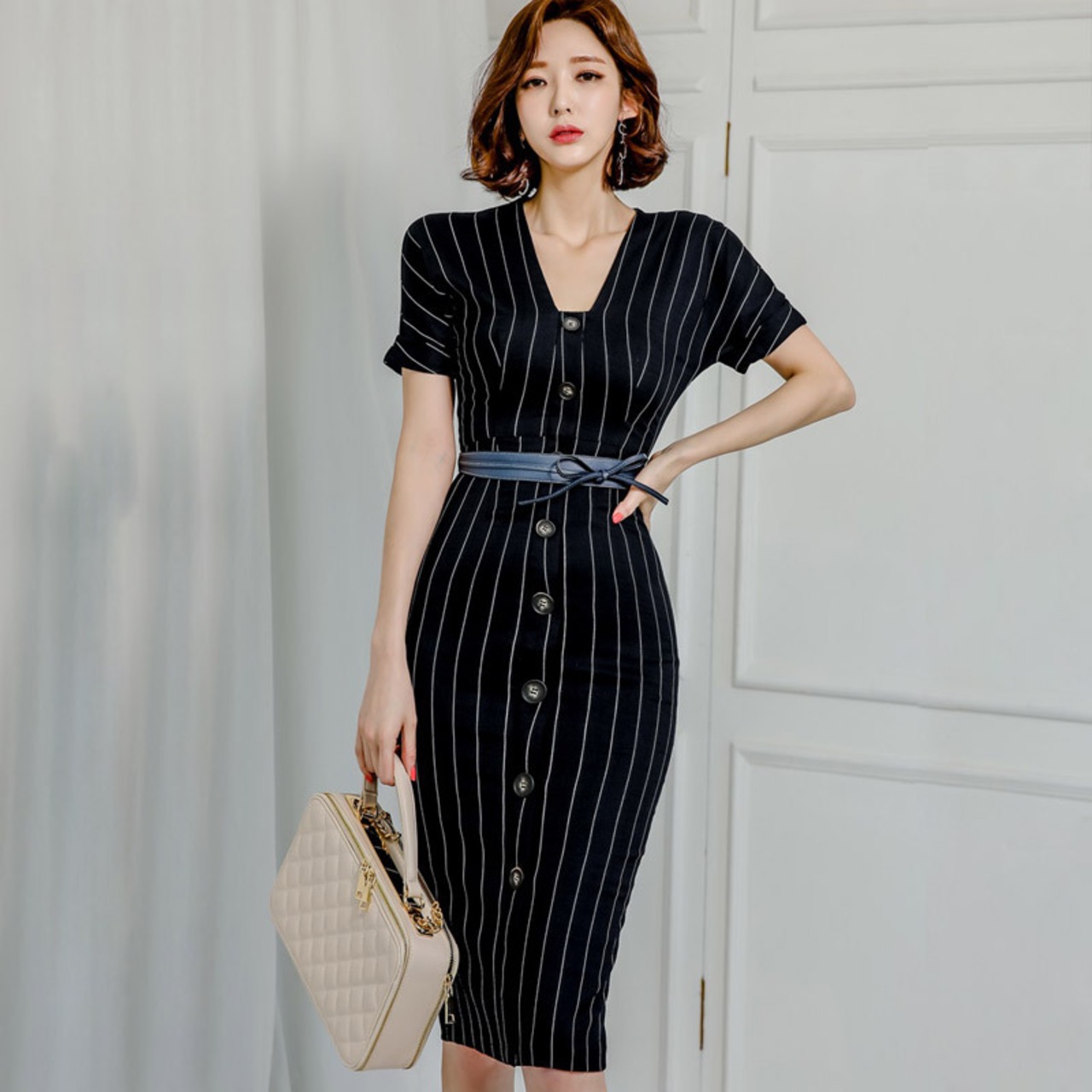 【新作】【送料無料】 VネックスリムウエストレディースペンシルドレスシングルブレストオフィスVestidosストライプボディコンドレス2019夏 サマー 夏物 会社 学校 通勤や通学にも 12b174987176461