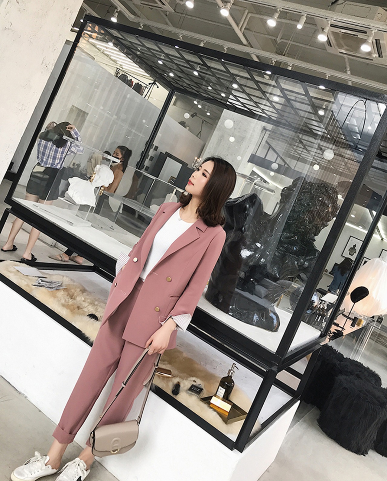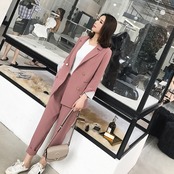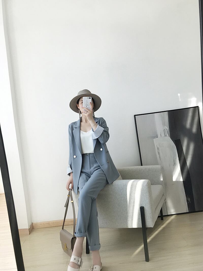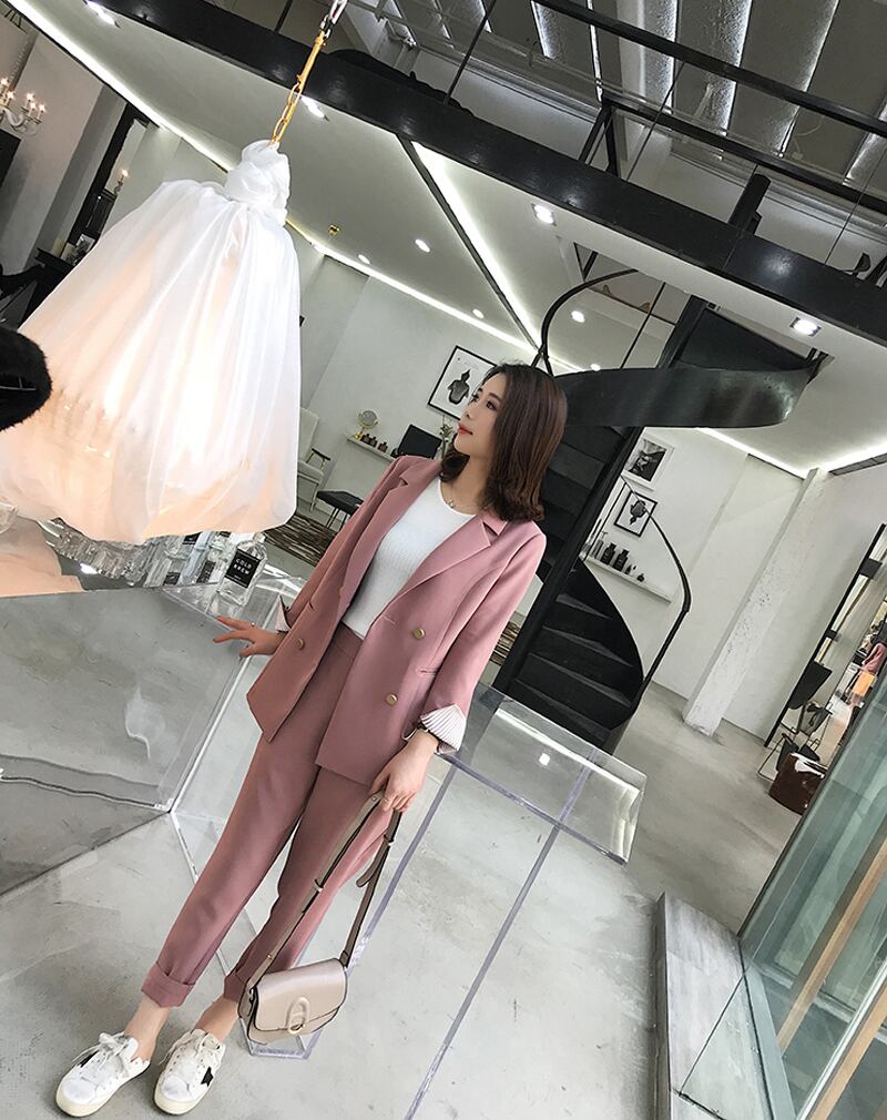 【新作】【送料無料】 ストライプスリーブダブルブレストレディースパンツスーツノッチブレザー&ウエストペンシルパンツソリッドOLスタイル2点セット2018 ソリッドカラー 12b171912920659
