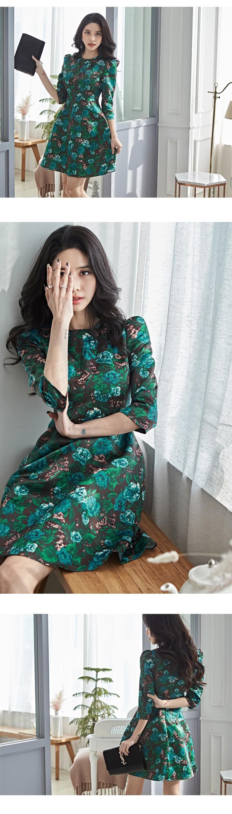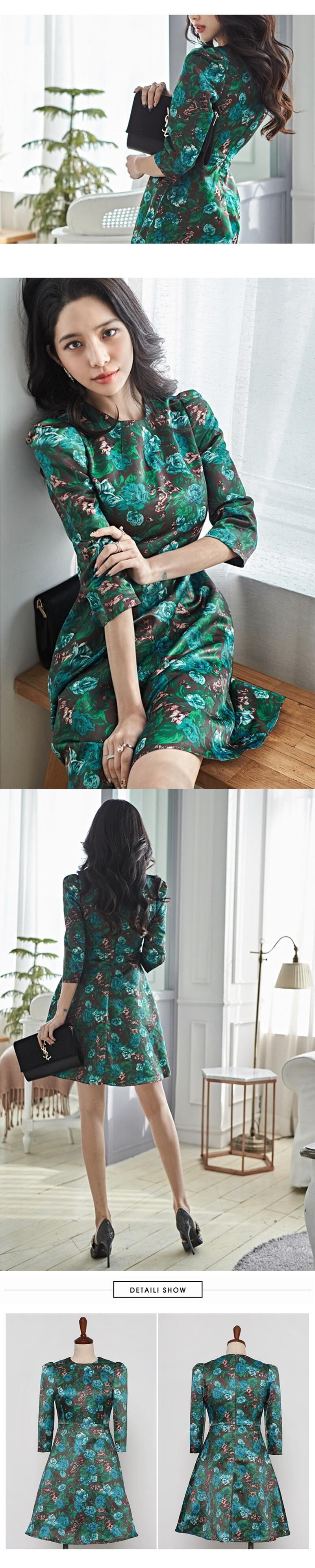 【新作】【送料無料】 BGTEEVEROネックプリントレディースドレス七分袖スリムウエストAラインドレスショートパーティー 12b159045420344