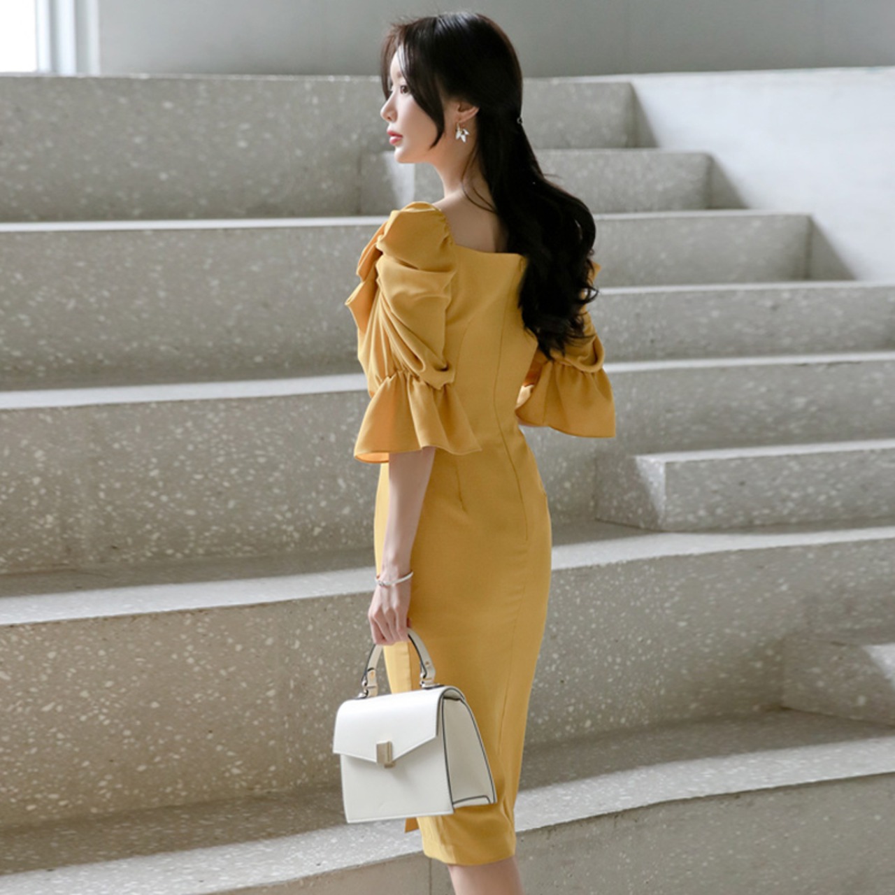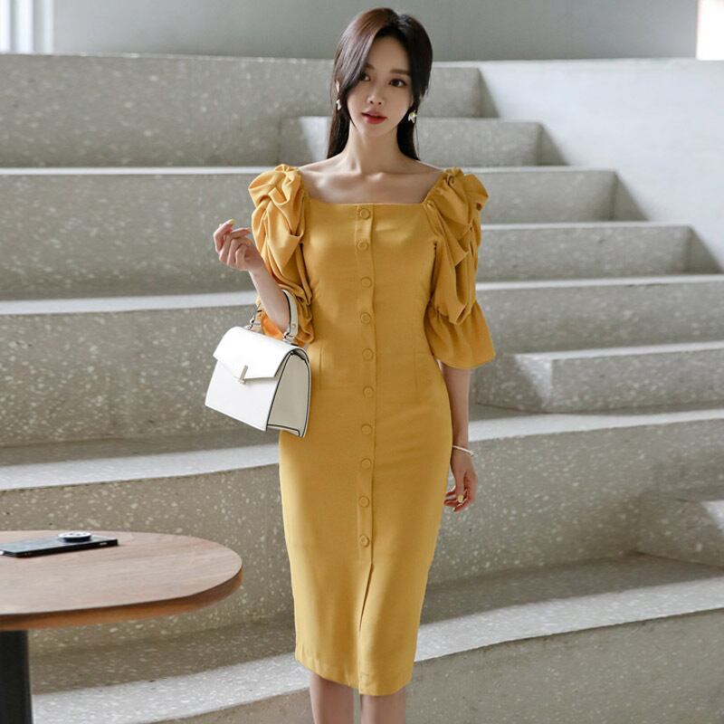 【新作】【送料無料】 ヴィンテージイエロースラッシュネックオフショルダーレディースシースドレスフロントボタンシャーリングスリーブミディドレスパーティーVestidos ビンテージ 12b110172873266