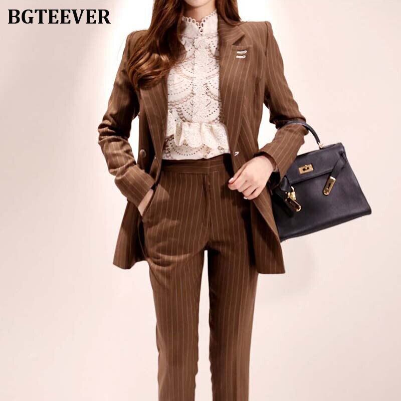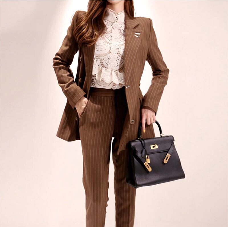 【新作】【送料無料】 ダブルブレストストライプレディースパンツスーツスリムレディースブレザースーツセットワークウェアパンツスーツ2019秋 オータム 秋物 12b119420276894