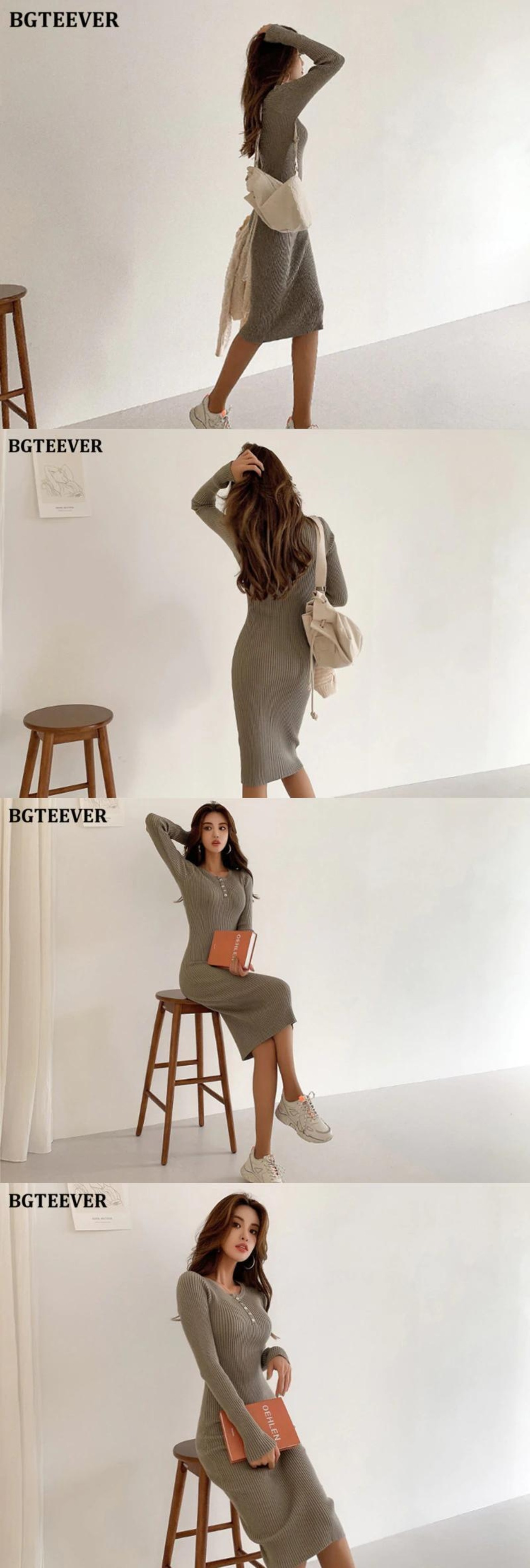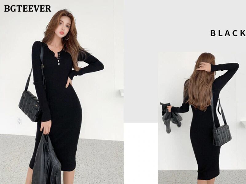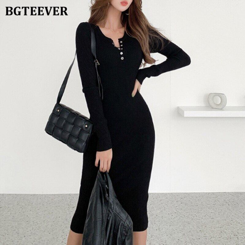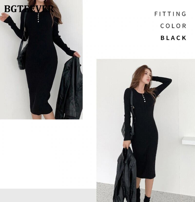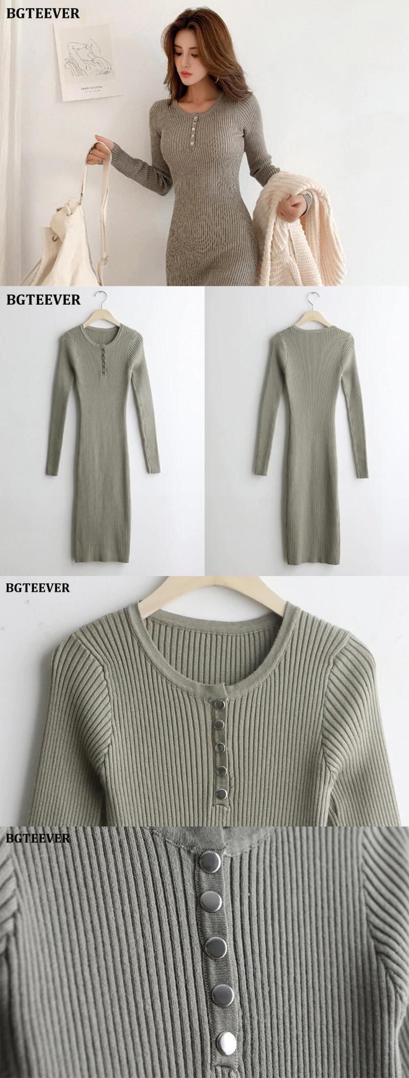 【新作】【送料無料】 BGTEEVERシックなヴィンテージボタン女性セーターミッドカーフドレスOネックスリムウエストニットドレス冬のボディコンVestidos ウィンター 冬物 ビンテージ 12b142628974561