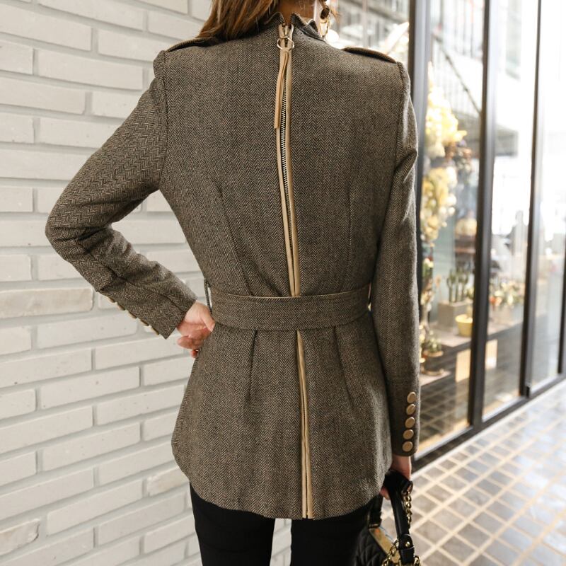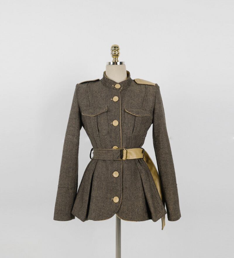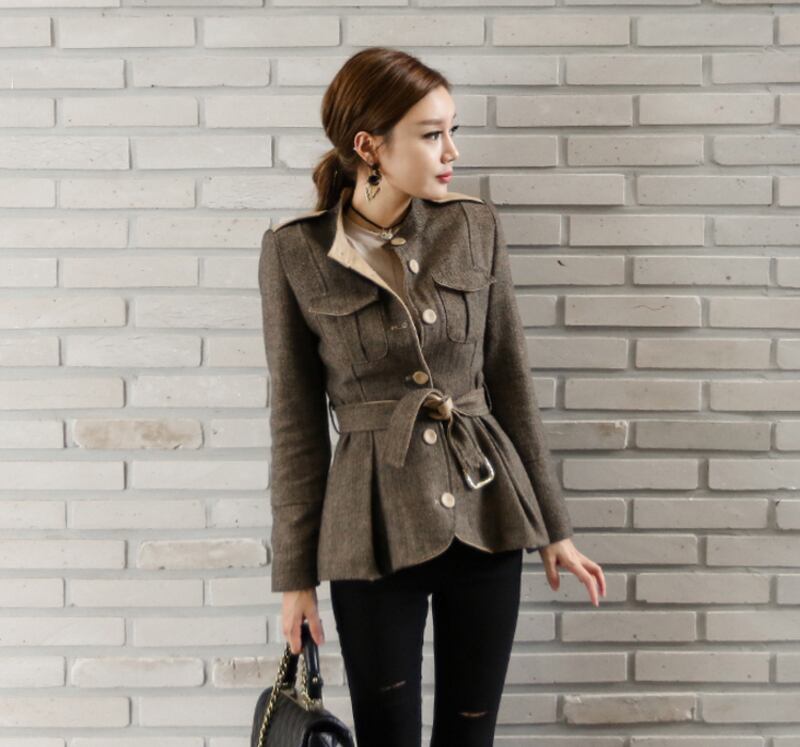 【新作】【送料無料】 シングルブレストスタンドカラーレディースショートブレンドコートウィンターバックジッパーサッシスリムウエストジャケットコートアウター 冬物 12b123347947228