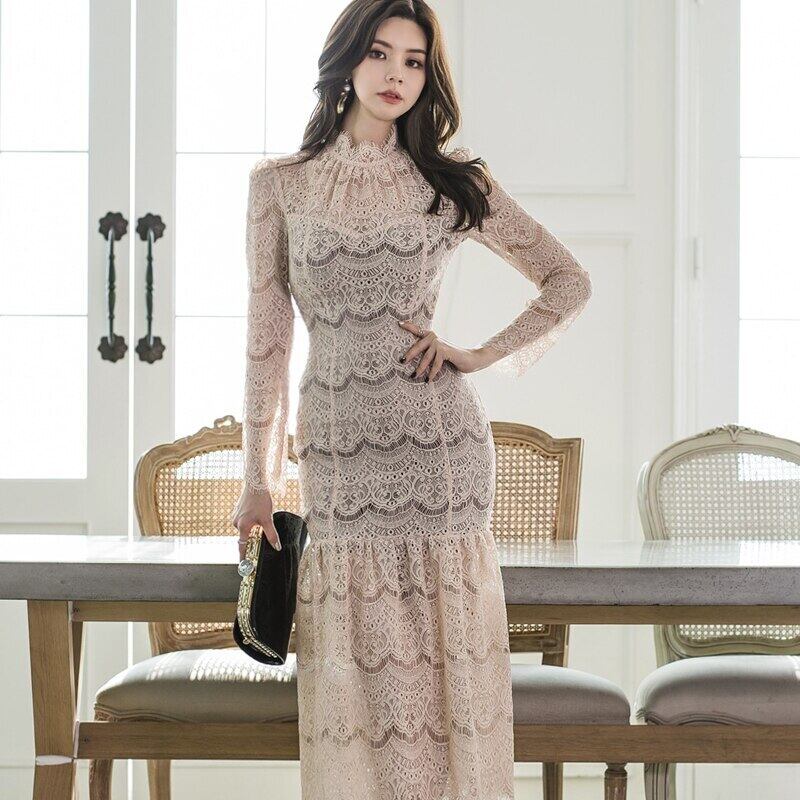 【新作】【送料無料】 BGTEEEVRスタンドカラースリムフローラルレースドレス女性フルスリーブボディコンドレスセクシーな中空アウトミディVestidos 花柄 12b157963191800