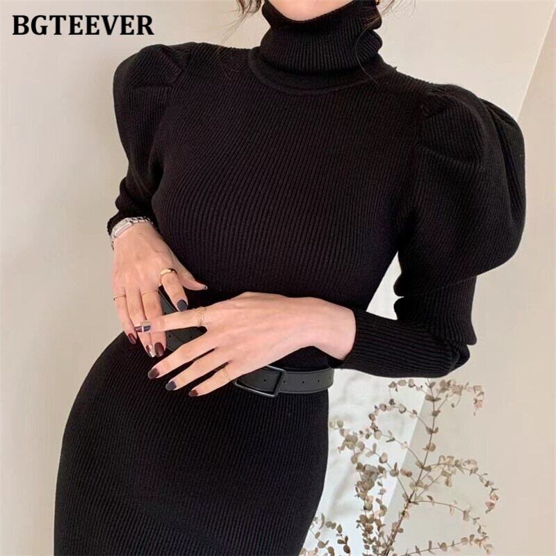 【新作】【送料無料】 BGTEEVERタートルネックパフスリーブブラックニットロングドレス女性秋冬スリムベルトスプリットセーターVestidos オータム 秋物 ウィンター 冬物 ハーネス 12b131145581164