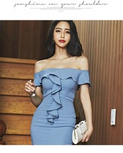 【新作】【送料無料】 セクシーなスラッシュネックフリルシースドレス女性フロントスプリットヒップパッケージミディドレス2019サマーパーティーVestidosローブファム ラッフル 夏物 フェミニン 12b138889970353