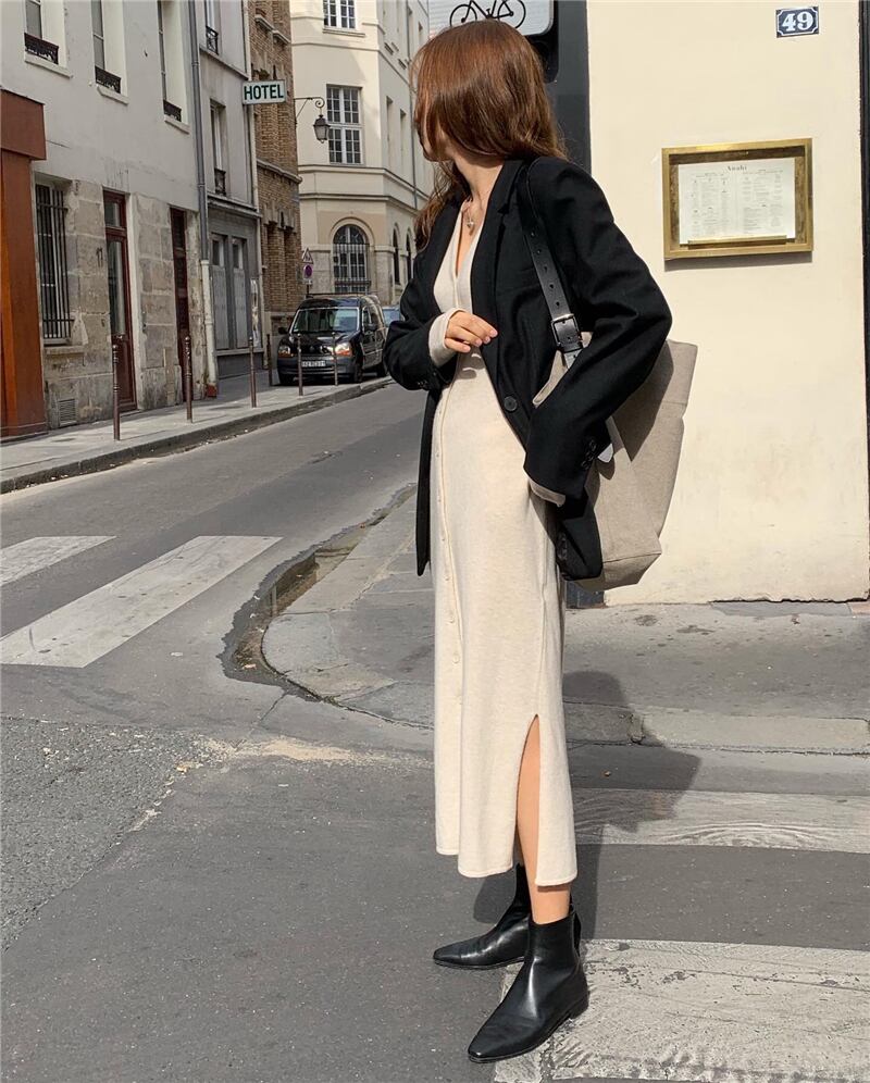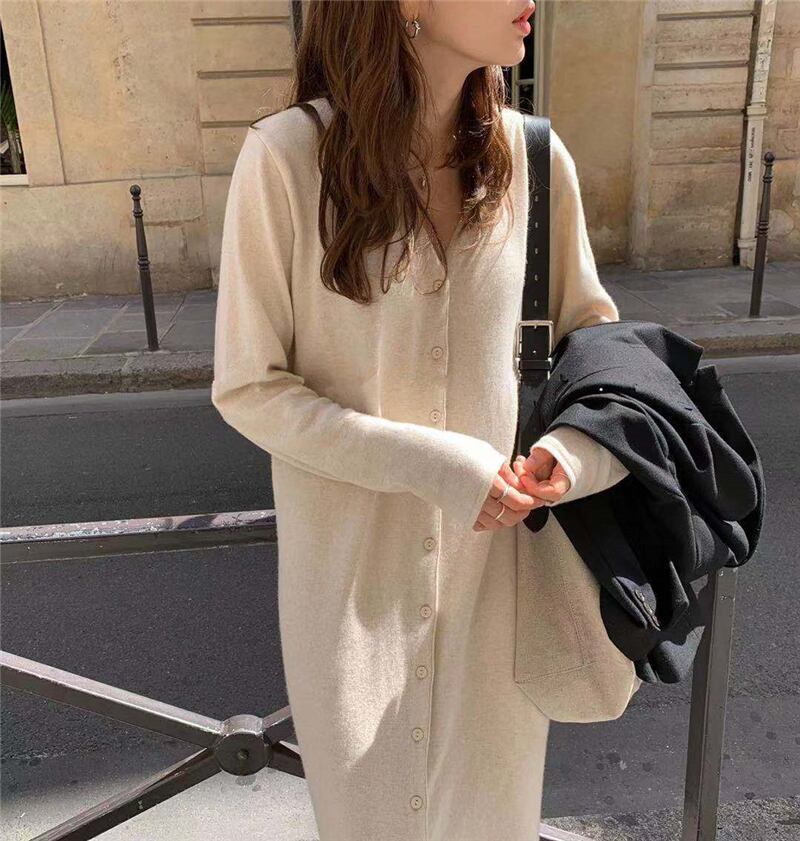 【新作】【送料無料】 Vネックシングルブレストレディースセータードレスシックなルーズウィンターヴェスティドスレディースマキシニットドレス2019 冬物 12b188623679915