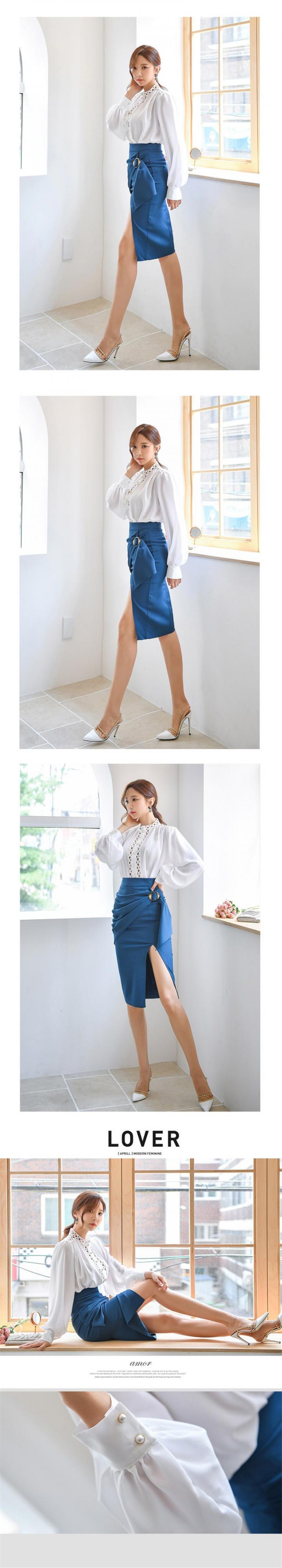 【新作】【送料無料】 BGTEEVER2ピースワークスーツパッチワークランタンスリーブブラウス&スプリットペンシルスカートレディーススカートスーツオフィスセット2019 会社 学校 通勤や通学にも 12b142320701821