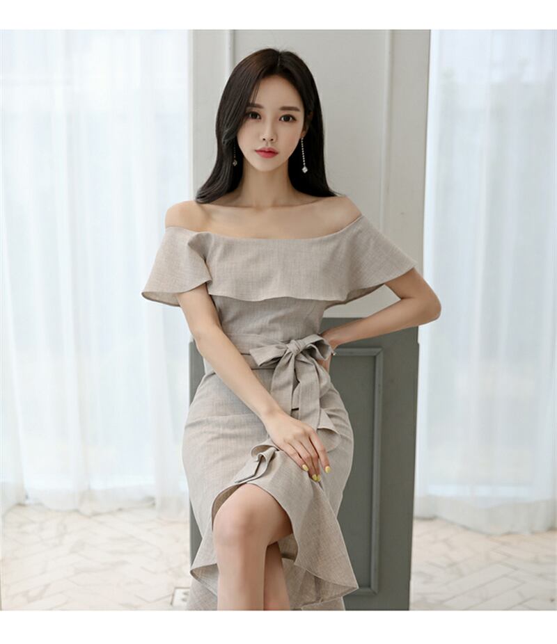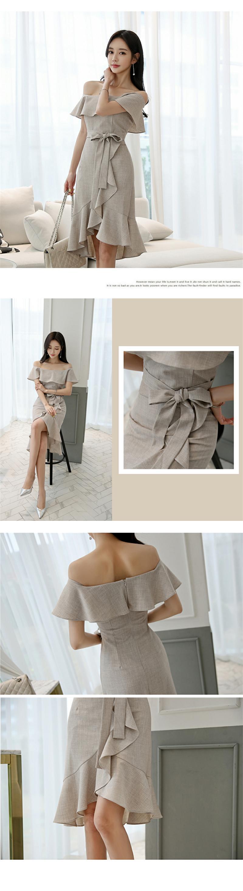 【新作】【送料無料】 スラッシュネックフリル女性Aラインドレススリムウエストレースアップ不規則なミドル丈ドレスオフショルダーVestidos夏 ラッフル サマー 夏物 12b198560438908