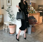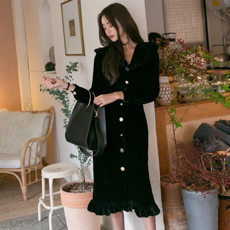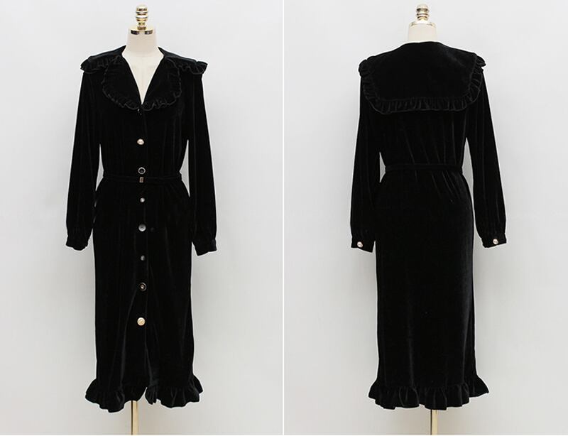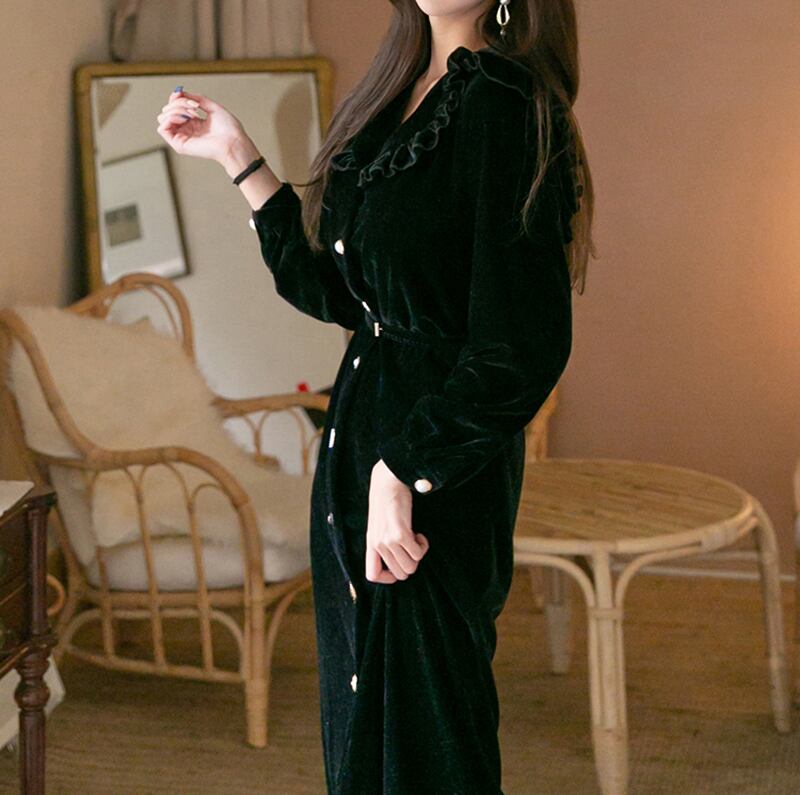 【新作】【送料無料】 ヴィンテージシングルブレストベルベット女性ロングドレスターンダウンカラーフリルVestidosfemmeスリムウエストウィンタードレス ラッフル 冬物 フェミニン ビンテージ 12b128967478395