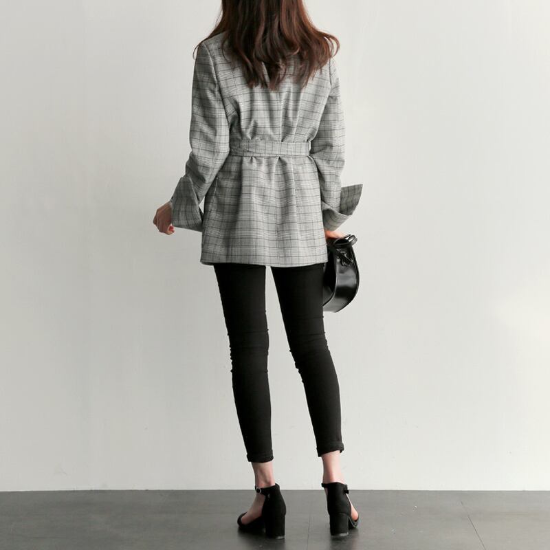 【新作】【送料無料】 春秋女性グレーチェック柄オフィスレディブレザーボウサッシュスプリットスリーブジャケットワークブレザーフェミニーノ リボン スプリング 春物 オータム 秋物 会社 学校 通勤や通学にも 12b16885851739