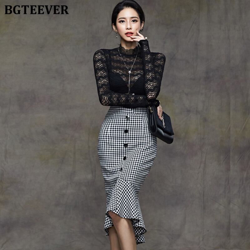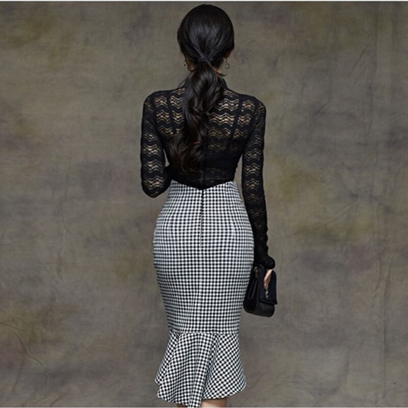 【新作】【送料無料】 BGTEEVERオフィス2ピースセットスリム透明レーストップス&チェック柄マーメイドスカートスーツ2019秋冬女性セット オータム 秋物 ウィンター 冬物 会社 学校 通勤や通学にも 12b153339034025