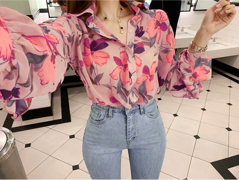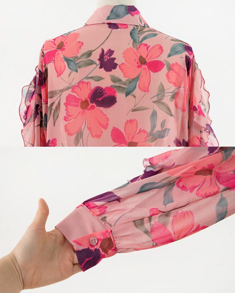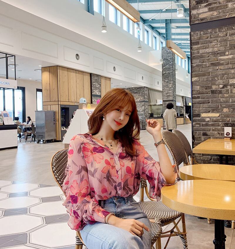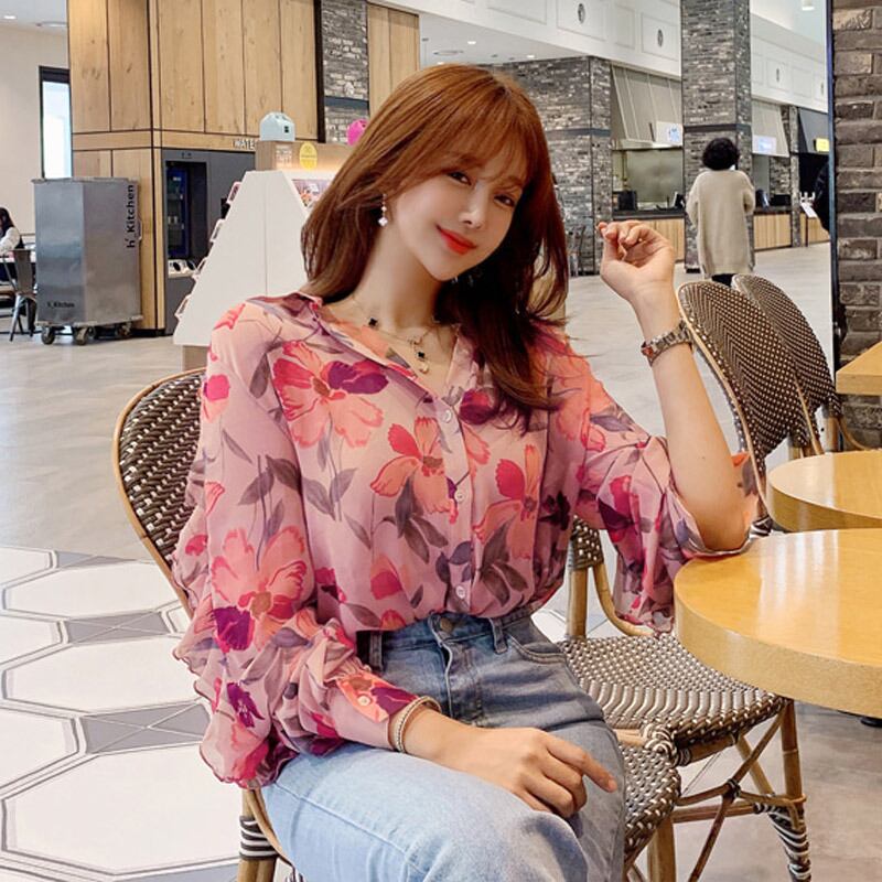 【新作】【送料無料】 ヴィンテージVネックフローラルプリントレディースシフォンブラウスシックなフリルシャツブラウス長袖トップスシャツ2019 ロング ラッフル 花柄 ビンテージ 12b112396908411