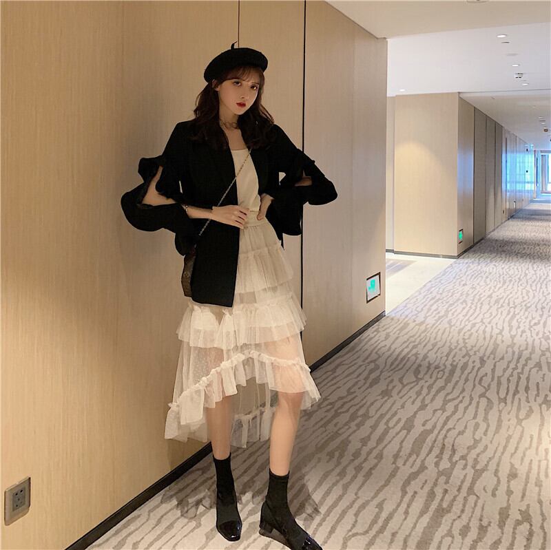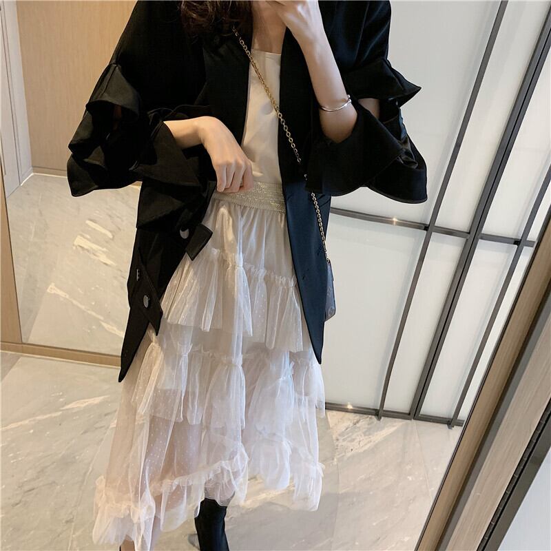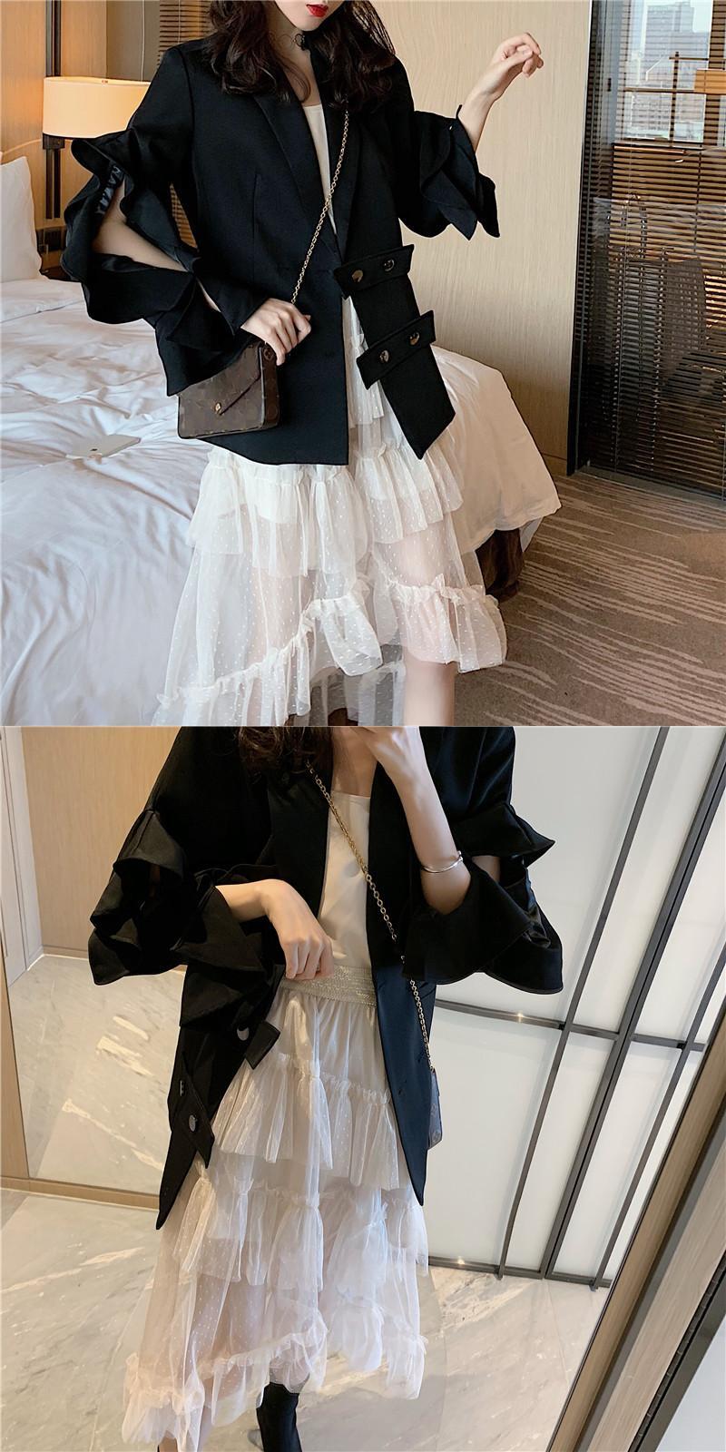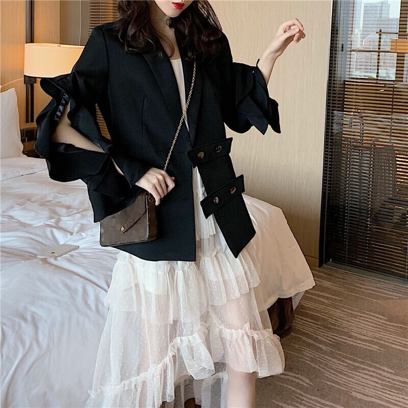 【新作】【送料無料】 フリルスリーブ中空アウト女性ブラックブレザーダブルブレストイレギュラーアウターオフィス2019 ラッフル 会社 学校 通勤や通学にも 12b116522170890