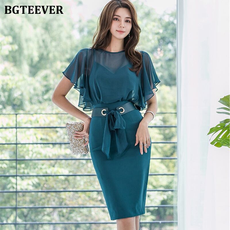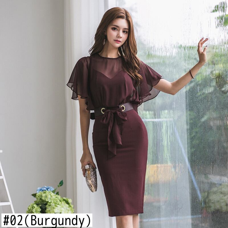 【新作】【送料無料】 BGTEEVERフリルスリーブレディースドレススリムウエストベルトペンシルドレスソリッドミディパーティー秋 オータム 秋物 ハーネス フェミニン ソリッドカラー 12b139658791730