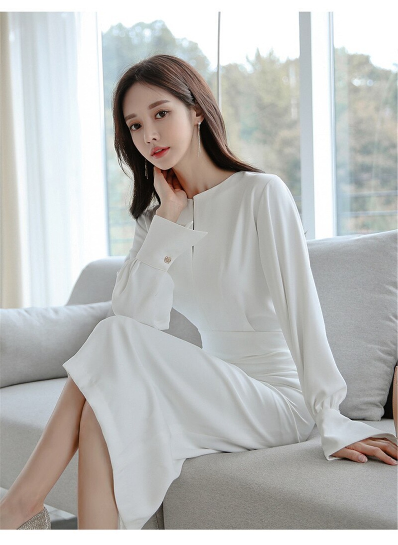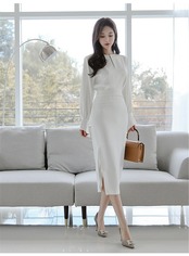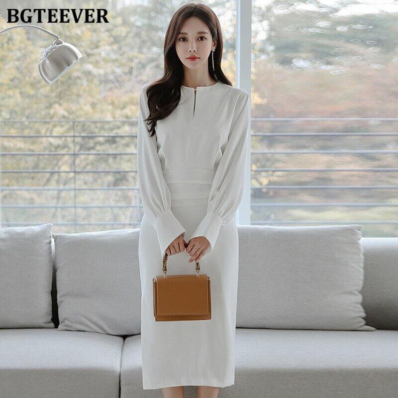 【新作】【送料無料】 BGTEEEVROネックスプリットソリッドレディースドレスOLスタイルパフスリーブスリムウエストミディドレスヒップパッケージ ソリッドカラー 12b120101463368