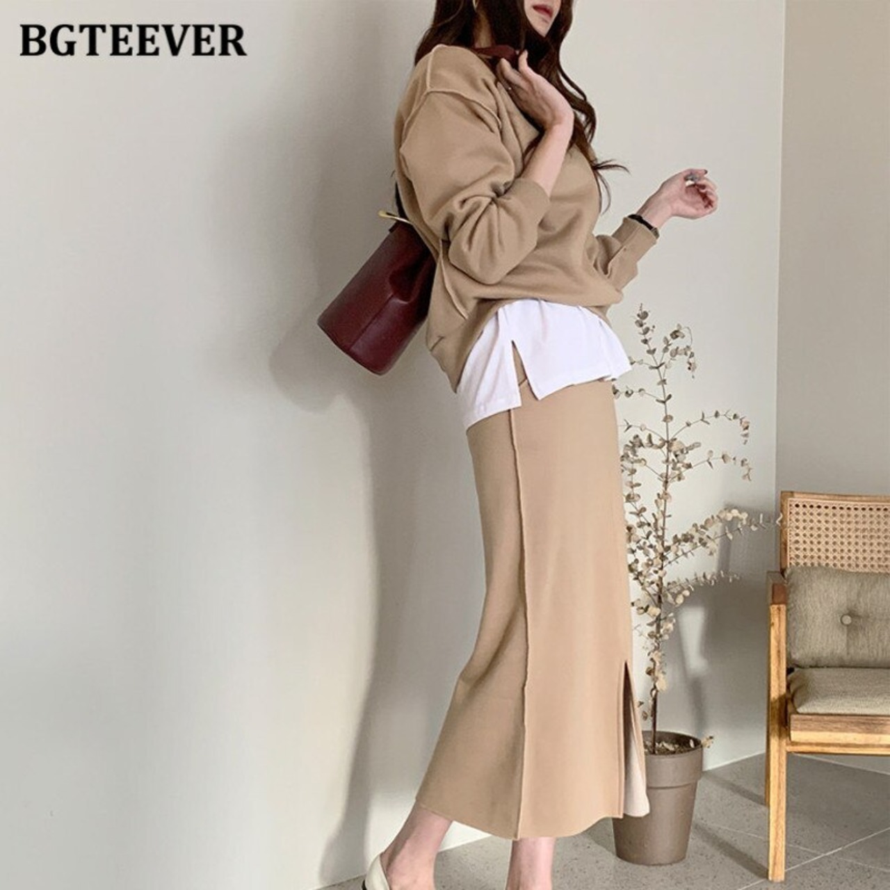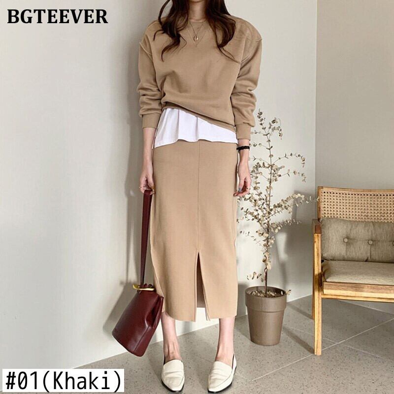【新作】【送料無料】 BGTEEVER Women 2 Pieces Set O-neck Pullover Sweatshirt&Elastic Waist Split Skirt 2020 Winter Tracksuits エラスティック 伸縮 ウィンター 冬物 スカート Oネック 12b189406483076