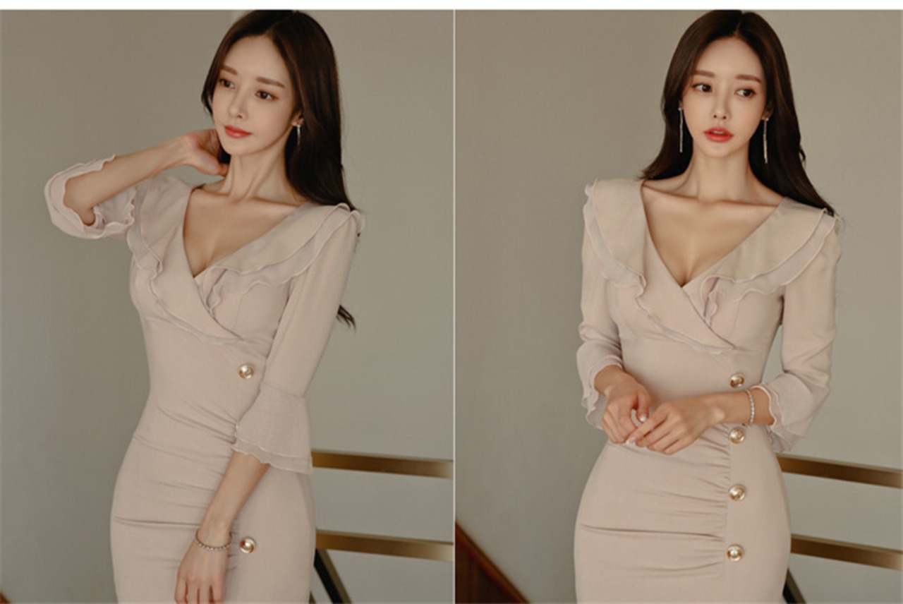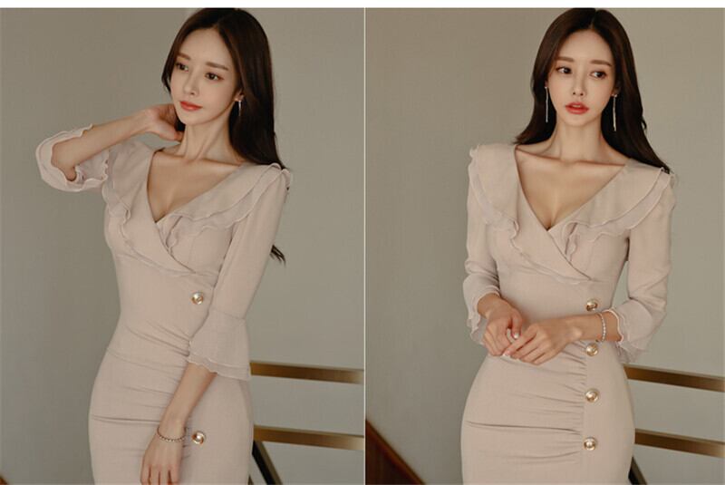 【新作】【送料無料】 BGTEEVERワークウェアVネックフリルスリムウエストレディースドレスシースバタフライスリーブドレスオータムスプリットボディコンVestidosfemme 秋物 フェミニン 12b186681063493