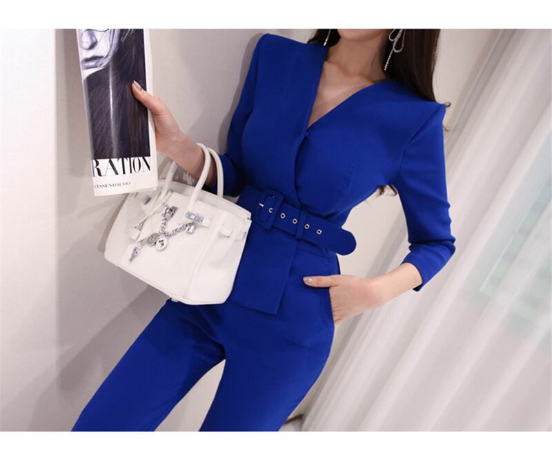 【新作】【送料無料】 ベルト付きウエストビジネスジャンプスーツ女性2019OLVネックワイドレッグロングプレイスーツ作業着ロンパース ハーネス ワイドパンツ 12b115839837465