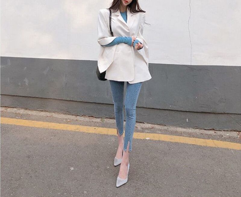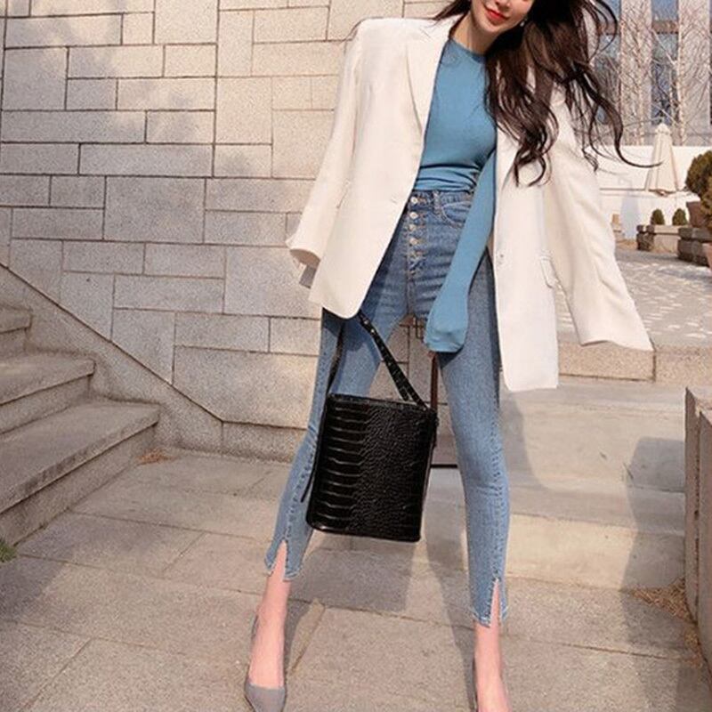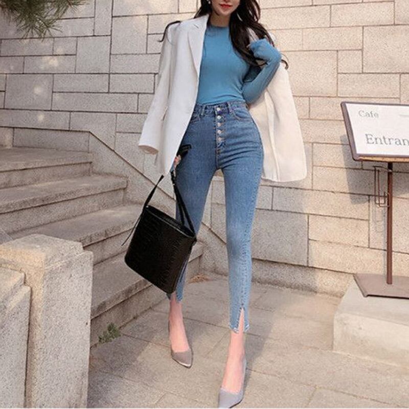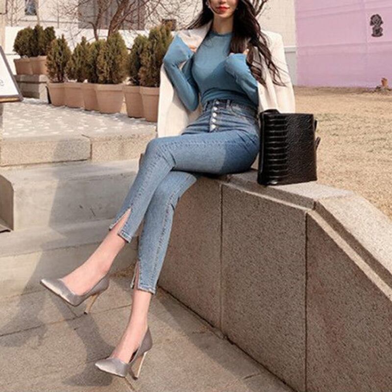 【新作】【送料無料】 ヴィンテージシングルブレストレディースデニムジーンズウエストストレッチパンツカプリストリートウェアスプリットカフジーンズパンツ2019秋 オータム 秋物 ビンテージ 12b142026111055